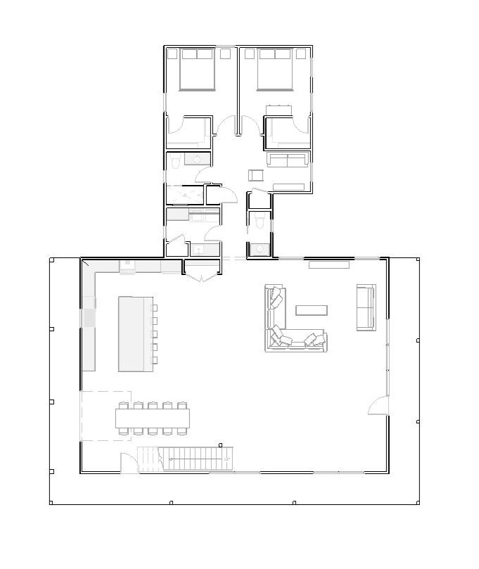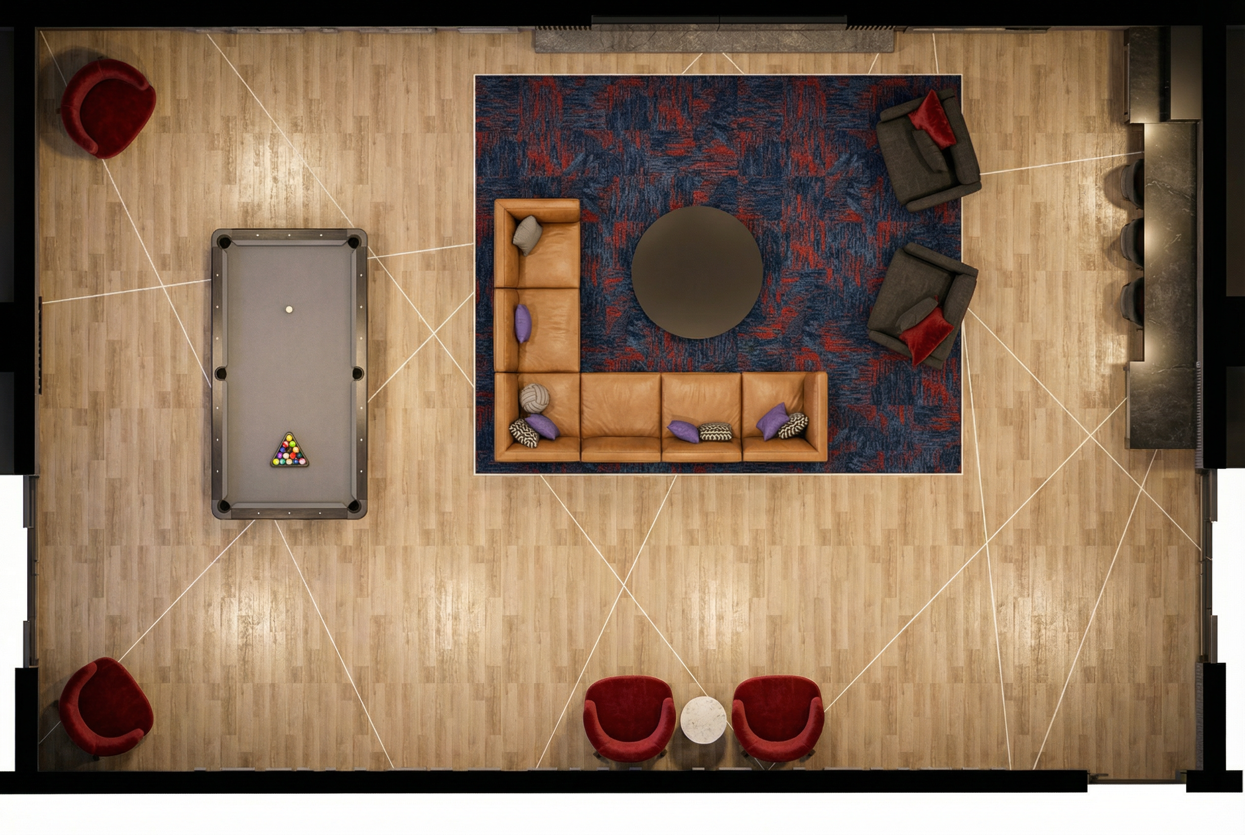 convert this floor plan into a minimalist isometric 3d view of a full house show the space from an elevated angle with furniture walls and details visible create a soft minimalist isometric rendering of this floor plan use thin clean linework and a warm neutral color palette with beige taupe and muted brown tones maintain flat pastel style fills for walls floors and furniture render furniture in simplified geometric forms with soft shadows that mimic natural daylight preserve the gentle scandinavian inspired aesthetic with smooth edges and minimal detail add long soft directional shadows consistent with the style reference include optional surrounding elements such as a lightly illustrated tree with soft textured foliage while keeping the overall composition clean airy and elegant match the softness colors lighting shadow direction and minimalist illustration style of the reference image but translate it into a 3d isometric perspective use the same furniture as shows on the plan do not change the orientation of the floorplan