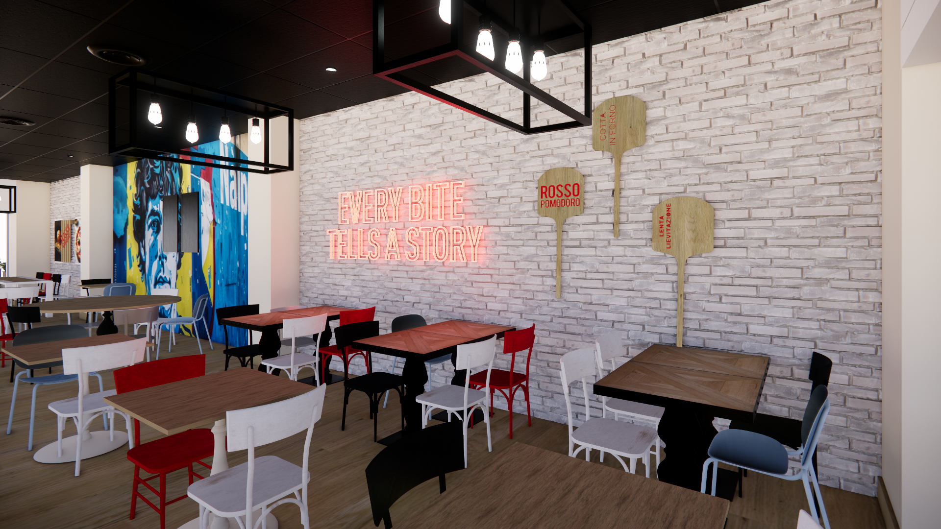 transform the provided restaurant interior image into a high end photorealistic render do not change the materials do not change the proportions do not chnage or add furniture only render the existing materials more photo realistic the brick is white bleached brick with light colored groun the photo on the wall is a wall paper the red black and white chairs are all on painted wood which shows some of the wood grain do not change the furniture maintain all furniture geometry and material
