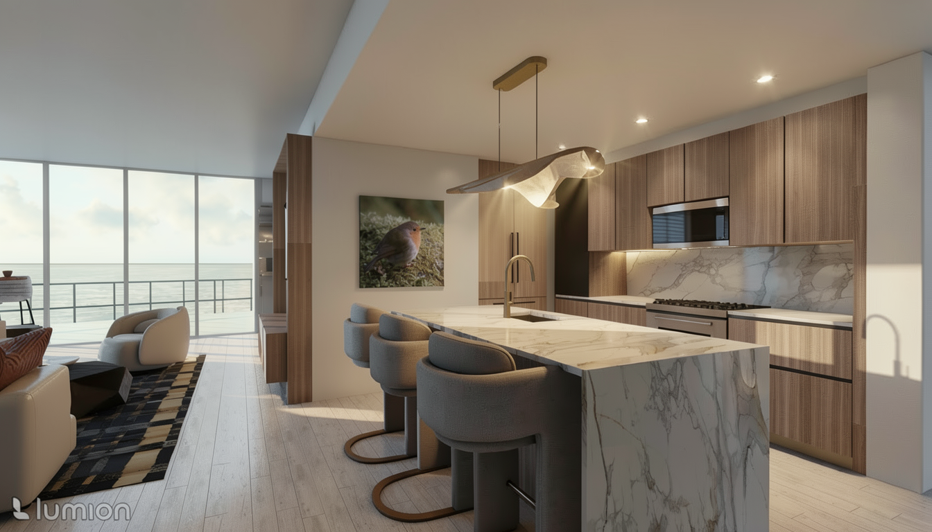 add more texture to this realistic render and add more depth to it add downlights in the ceiling where there is three gaps in front of the main kitchen unit only and some lighting atmosphere add lighting atmosphere from the pendant above the kitchen island fix the wood texture where it looks a bit off do not any downlights in the living room space and remove the downlight above the bird painting all together i dont want that at all please fix the wood texture on the media wall that it is almost perpendicular to this vie view