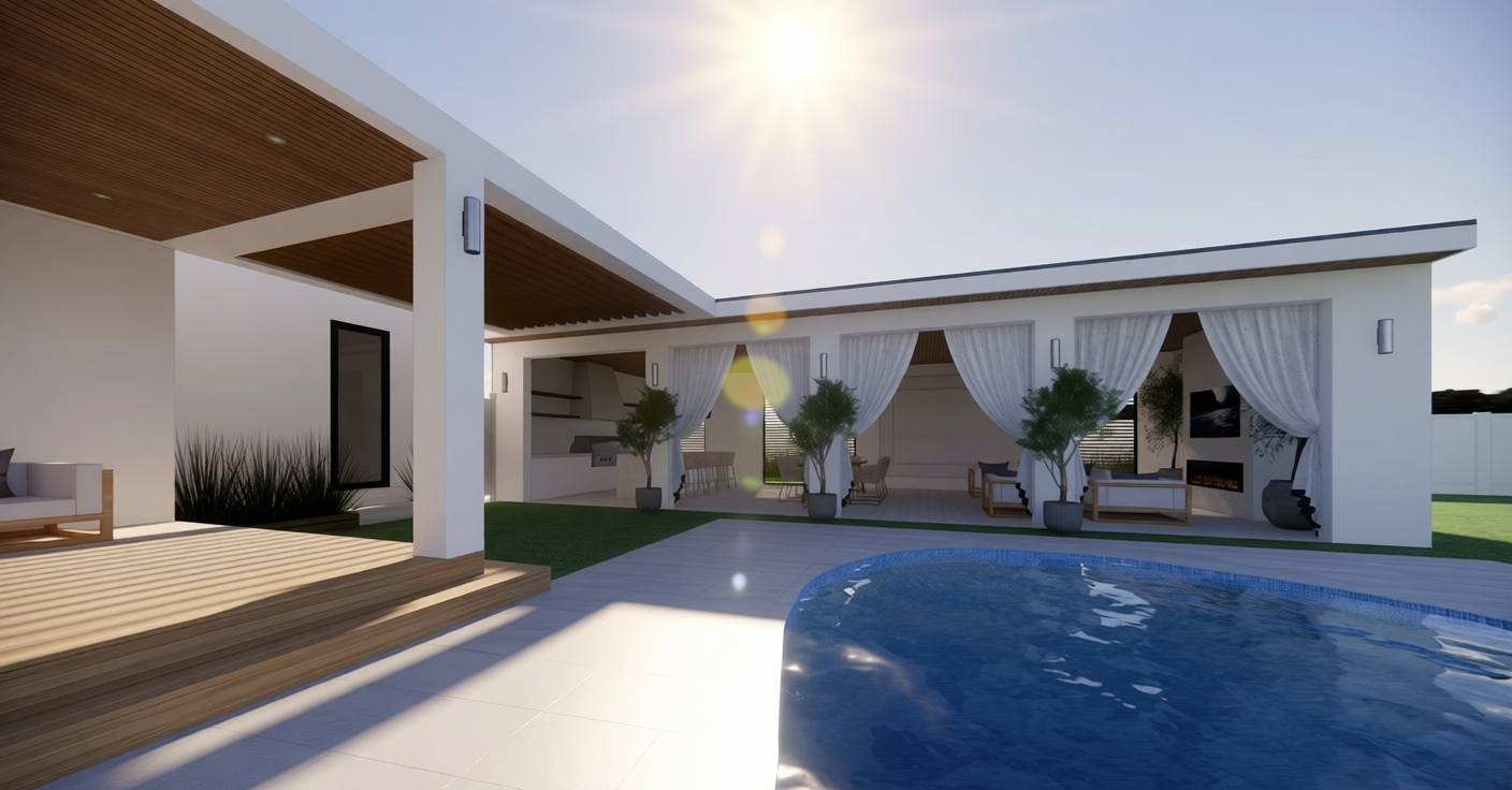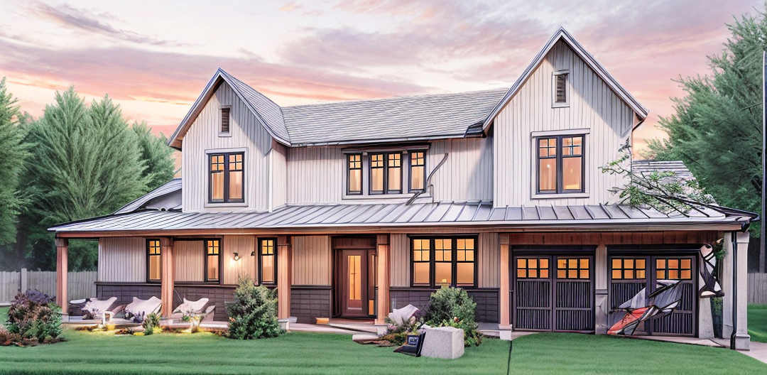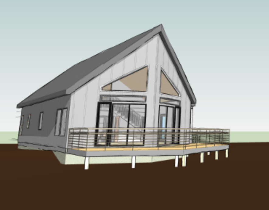 enhance architectural elevation to a clean professional render remove all text notes callouts and hide any footer or annotation overlays smooth topography and landscaping sharpen structure lines and improve proportion enhance exterior material realism including standing seam metal roofing with crisp seams high contrast board and batten siding and smooth lap siding with natural light shadowing improve texture detail and depth add subtle highlights and soft reflections natural daylight realistic shadows neutral sky photorealistic tone keep original geometry layout and massing true to the design stay to the proportions of drawing do not add what is not there
