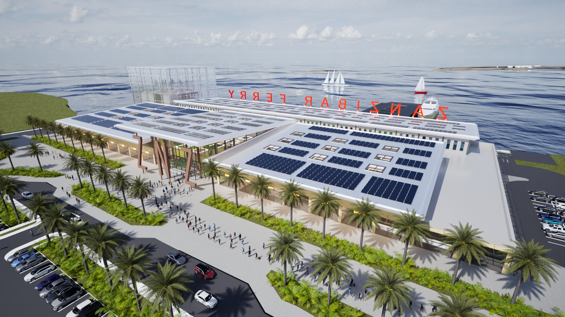 render a modern ferry terminal with a spacious design featuring a striking entrance the roof is adorned with solar panels in deep navy blue while the building exterior showcases sleek metallic and light beige tones surrounding the terminal are lush palm trees with vibrant green leaves and light brown trunks the parking area is filled with a variety of vehicles in black white and red above a clear sky with soft wispy white clouds creates a bright and inviting atmosphere the ocean in the background reflects a serene blue enhancing the coastal vibe add a sense of bustling activity with small figures of people entering and leaving the terminal the atmosphere is lively and futuristic emphasizing sustainability and travel