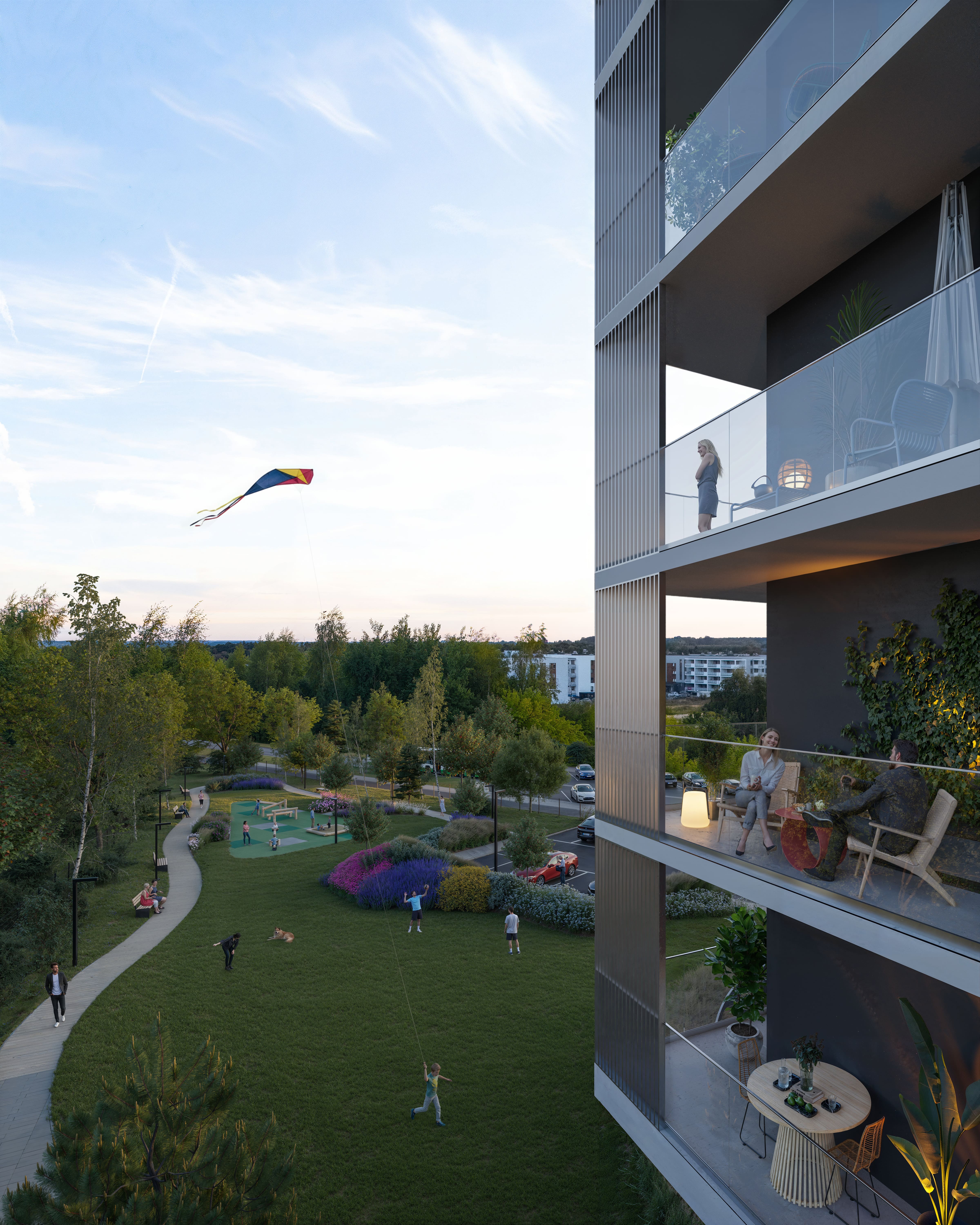 convert this floor plan into a realistic isometric 3d view of a full house show the space from an elevated angle with furniture walls and details visible keep the exact building architecture facade balconies windows and proportions unchanged do not modify the building structure change the environment and atmosphere different landscaping with richer grass and flowers more trees and plants in the park area people relaxing and walking change the weather to warm sunset golden hour with soft orange light and longer shadows slightly adjust the camera perspective to feel more frontal toward the building while keeping the same architecture ultra realistic architectural visualization premium residential development marketing render use the same furniture as shows on the plan do not change the orientation of the floorplan