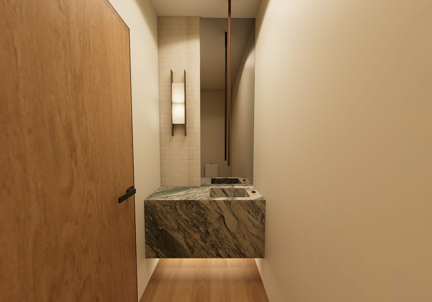 photorealistic interior render of a narrow modern powder room maintain exact geometry layout proportions and all existing materials from the model with no alterations walls finished in warm creamy off white roman clay plaster with subtle texture feature wall behind vanity clad in vertically stacked small format textured tile in a light neutral tone floating monolithic stone vanity in heavily veined marble with dramatic organic veining integrated rectangular sink no visible faucet fixture above the sink wall penetration only if present do not add or reinterpret faucet design tall narrow frameless borderless mirror mounted above vanity vertically aligned vertical sculptural wall sconce centered on tile feature wall with a rectangular stone or plaster backplate and slim dark metal side supports soft diffused glow warm color temperature 2700k minimal wood door with flat panel and dark hardware on left side light natural wood flooring with matte finish lighting is soft warm and moody powder room ambiance hidden recessed ceiling lighting not visible plus the single wall sconce as the primary visible light source no additional light fixtures emphasize soft shadows indirect lighting and realistic light falloff no overexposure no harsh highlights camera positioned at human eye level 5 ft straight on view centered on vanity tight space perspective with slight wide angle lens approx 24 28mm equivalent without distortion materials must appear highly realistic with accurate scale micro texture and subtle imperfections no added decor no styling objects no extra fixtures no redesign of any elements style high end architectural digest minimalist warm refined moody