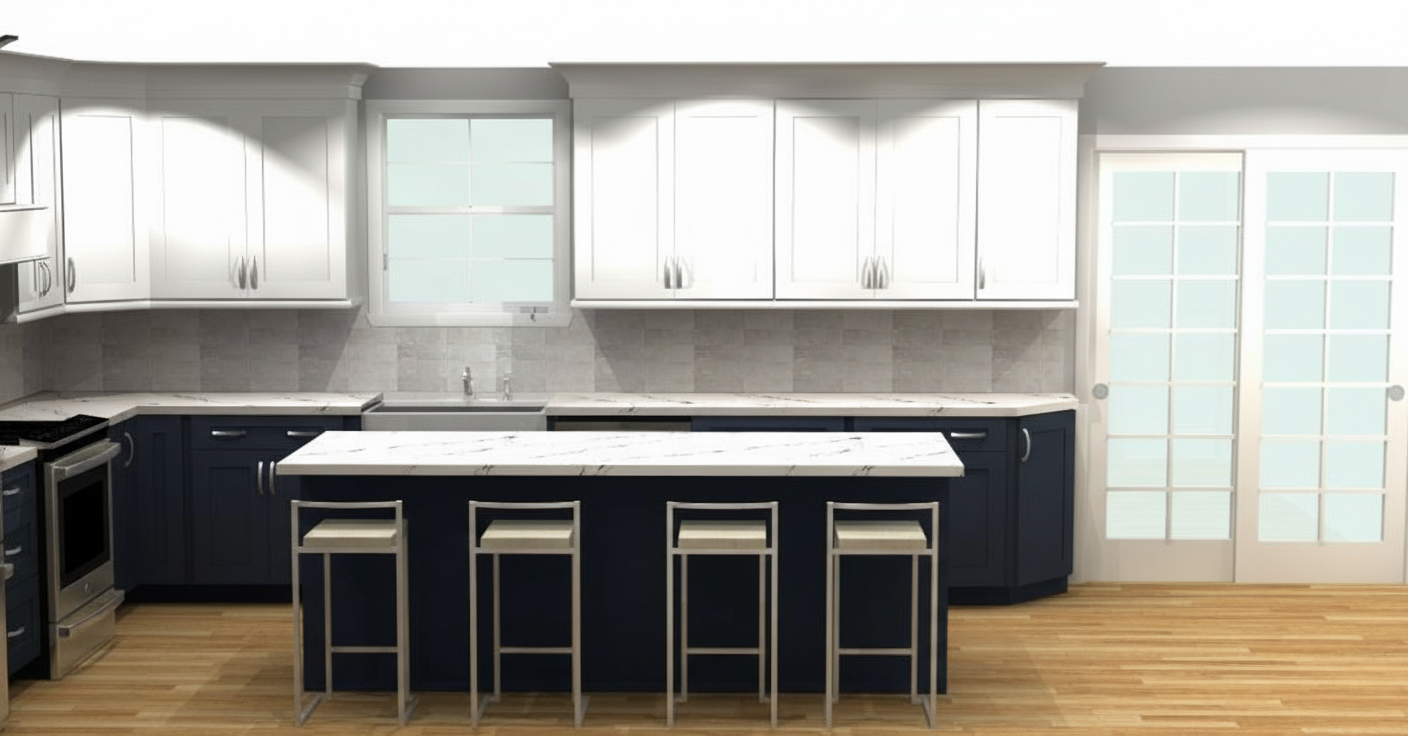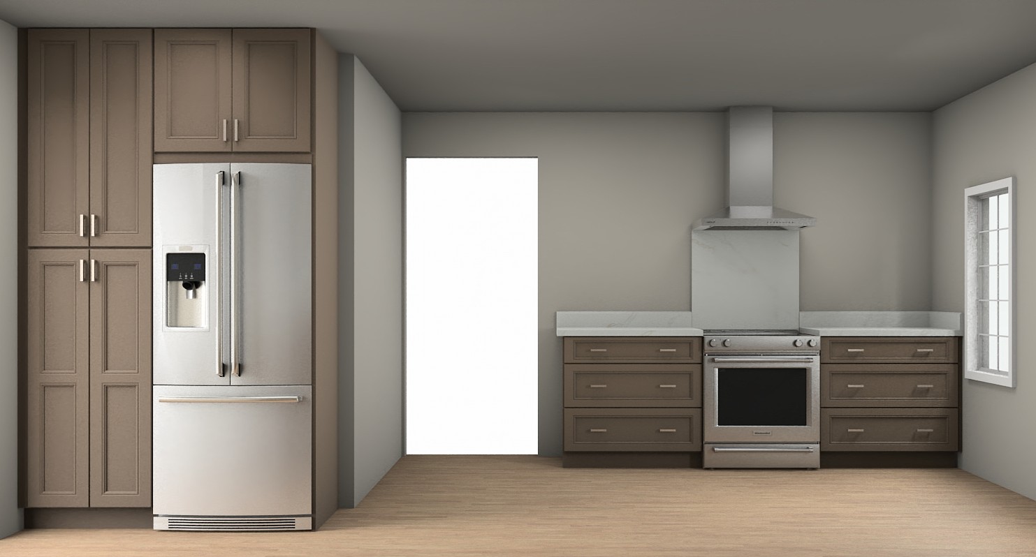 render a modern kitchen with sleek minimalist design use soft taupe for the cabinets giving them a warm and inviting feel the refrigerator and oven should be stainless steel reflecting a sleek contemporary look incorporate a subtle light gray for the walls creating a calm and neutral backdrop the countertops should be a pristine white marble adding elegance and contrast use natural wood tones for the flooring to bring warmth and texture ensure the lighting is soft and ambient creating a welcoming and cozy atmosphere