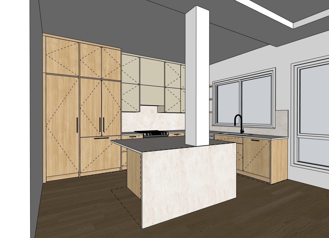 do not move or modify any elements make the rendering photo realistic do not add or remove door handles countertop make it slightly glossy and replace it with calacatta marble make edge lines look less sketchy and more realistic add natural sunlight coming from the windows on the right i want the image to appear not too warm add daily kitchen objects along the perimeter countertop only add a plant on one of the floating shelves