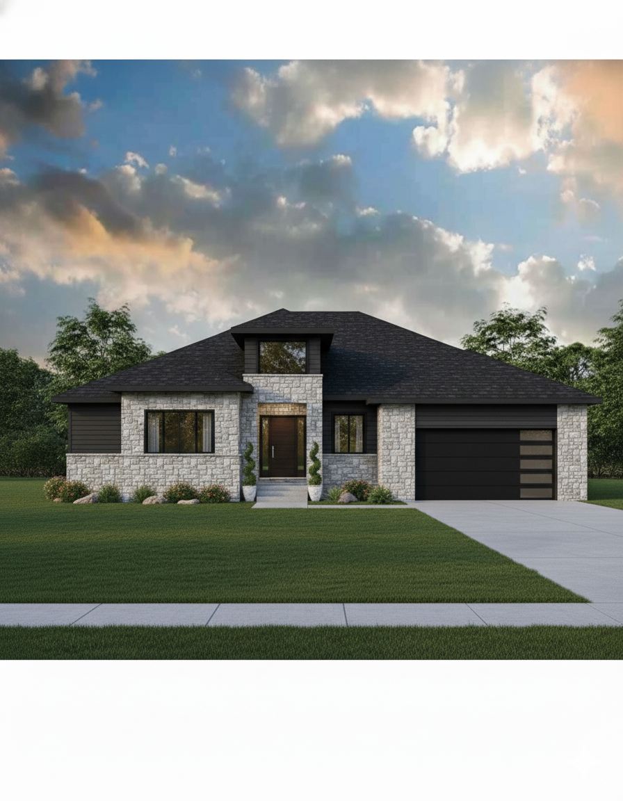wide the view and enhance detail smooth the face of the sone and add land scaping left and right have more depth add more sun and smoothe shade add more grass to picture ad light inside the house thru the windows show interior