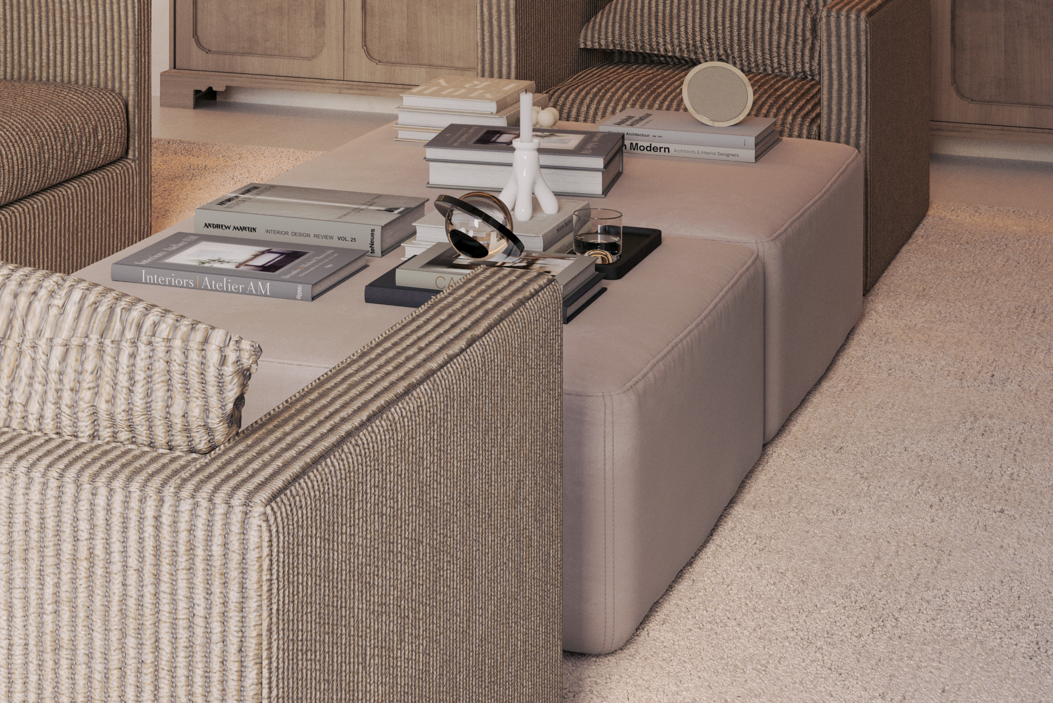 interior shot replace the current puffs with books on top with the footrest attached