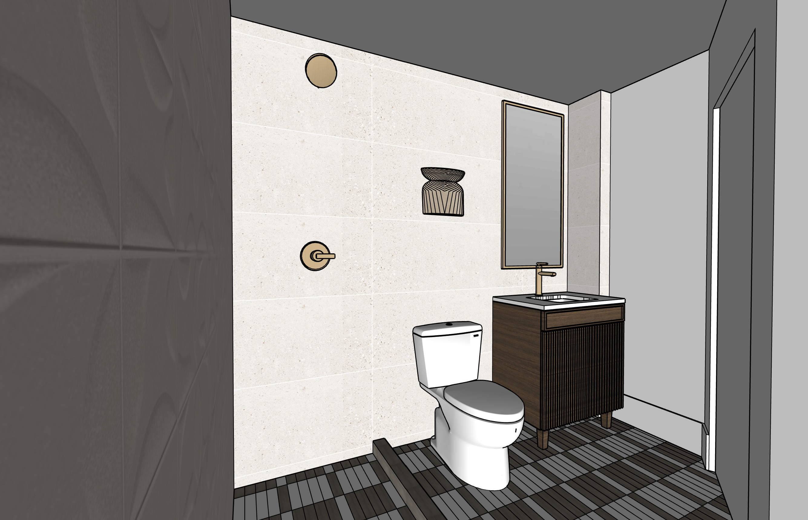 ultra photorealistic interior photograph of a bathroom maintain the exact architecture layout and finishes from the original render the space features warm neutral tones materials should appear highly realistic lighting should feel daytime and cinematic shot as professional interior architecture photography with a full frame camera 24mm lens shallow but natural depth of field extremely high dynamic range crisp focus subtle lens imperfections and natural exposure style similar to high end architectural photography seen in a design magazine ultra detailed photorealistic materials ray traced lighting global illumination cinematic composition natural color grading realistic textures professional interior photography do not change layout no redesign no extra windows no people no clutter no surreal lighting no warped geometry