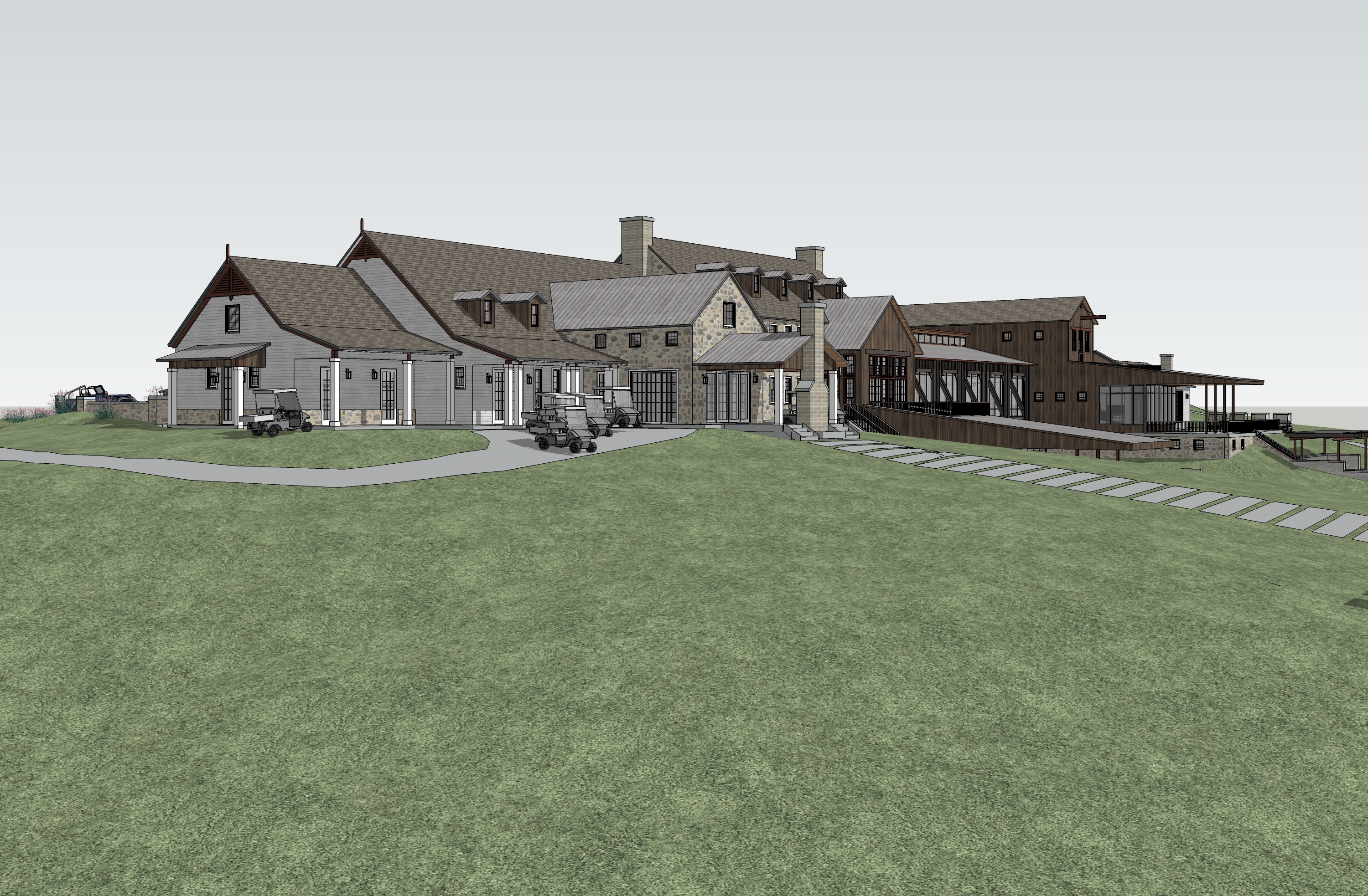 industrial design mill house with vertical matte wood shiplap steel bridge with wood slats old stone farmhouse with carriage house attached tall grass foreground trees in background sunlight on building face fog
