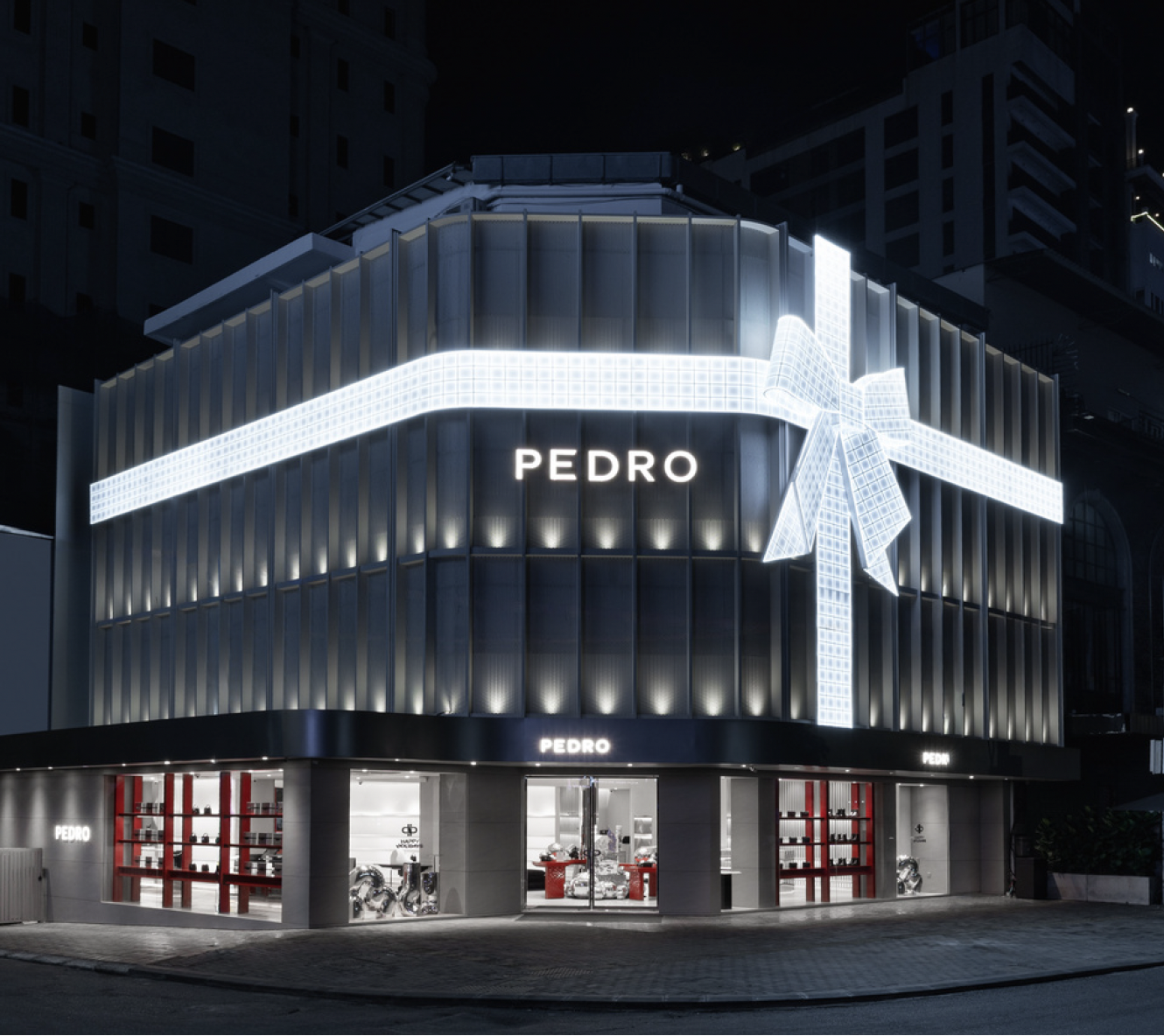 extend the original photographed image of the pedro retail building at night keep the building illuminated ribbon and signage exactly as they are expand the scene horizontally on both sides to create a wide panoramic composition suitable for a laptop screen ratio the extended surroundings should blend seamlessly with the existing urban environment lighting and architectural style maintaining the same nighttime atmosphere