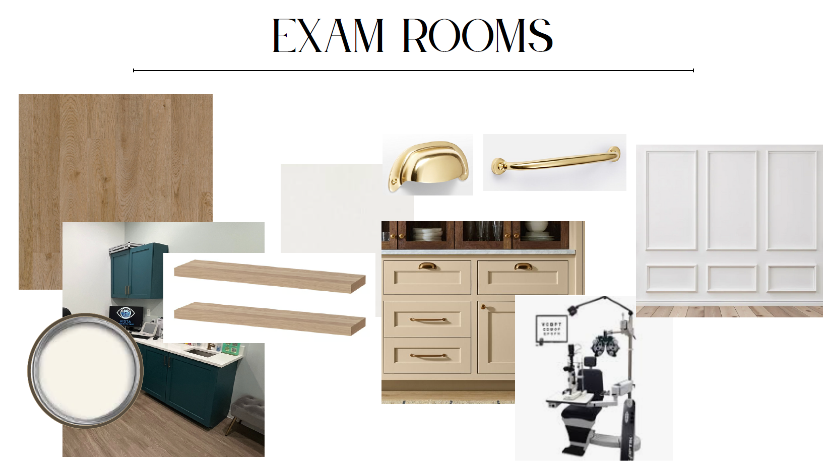 interior shot create a modern exam room with elegant and calming aesthetics use a light oak wood floor adding warmth and organic texture incorporate optical exam chair s use cream colored walls to create a calming atmosphere add beige shaker style cabinets accented with gold handles for a touch of luxury place white paneled walls for a classic and refined look the room should have an eye exam chair and equipment keeping it professional yet inviting the overall atmosphere should be tranquil and welcoming combining functionality with a contemporary style