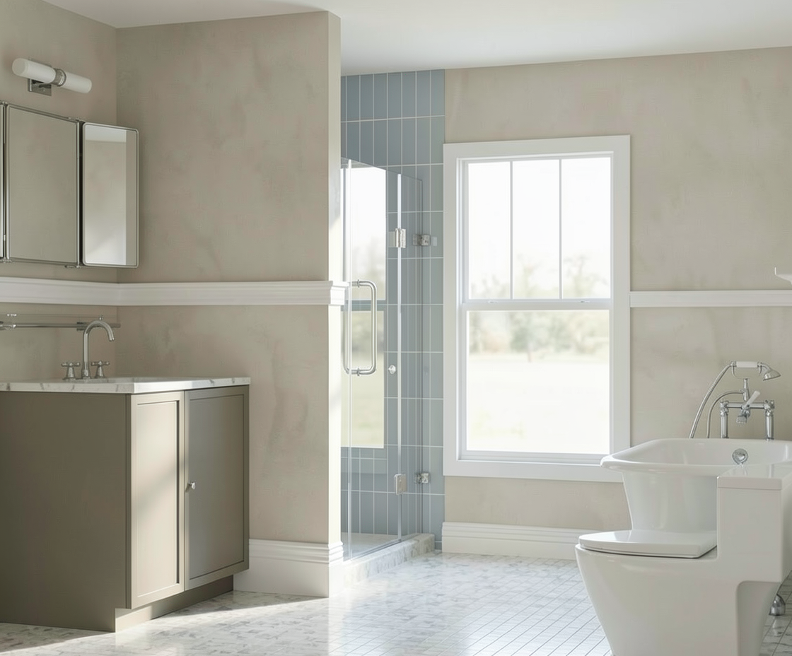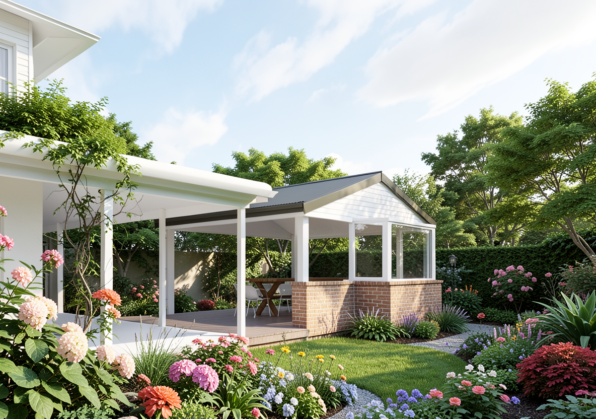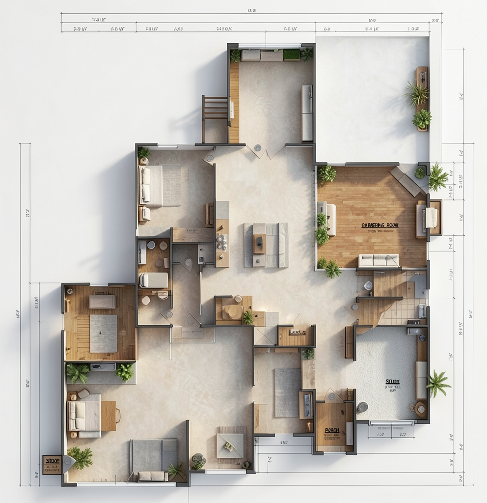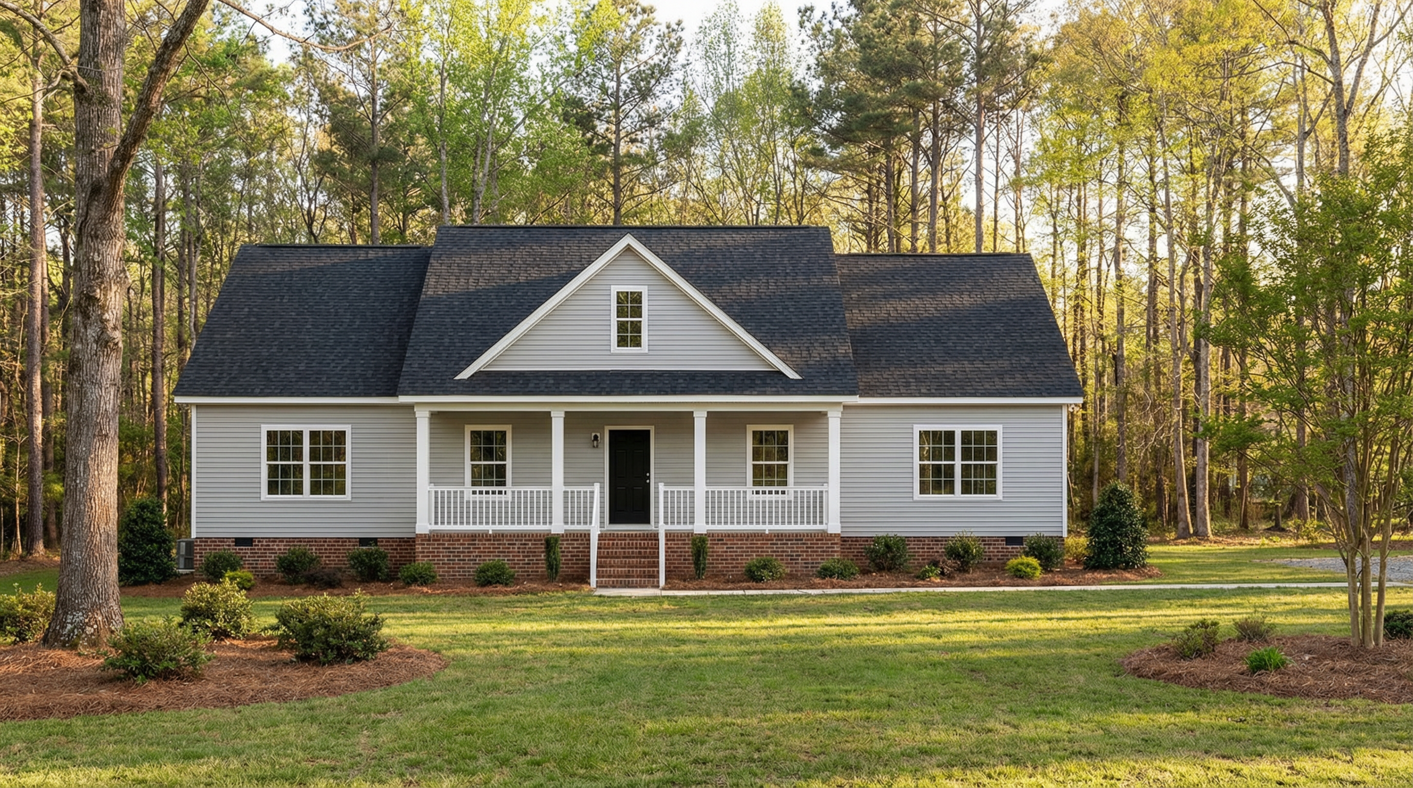 make as photorealistic as possible while keeping textures the same as selection professional landscaping in a lightly wooded scene with good lighting match materials to plan and remove any text light grey siding white trim windows black solid frontdoor