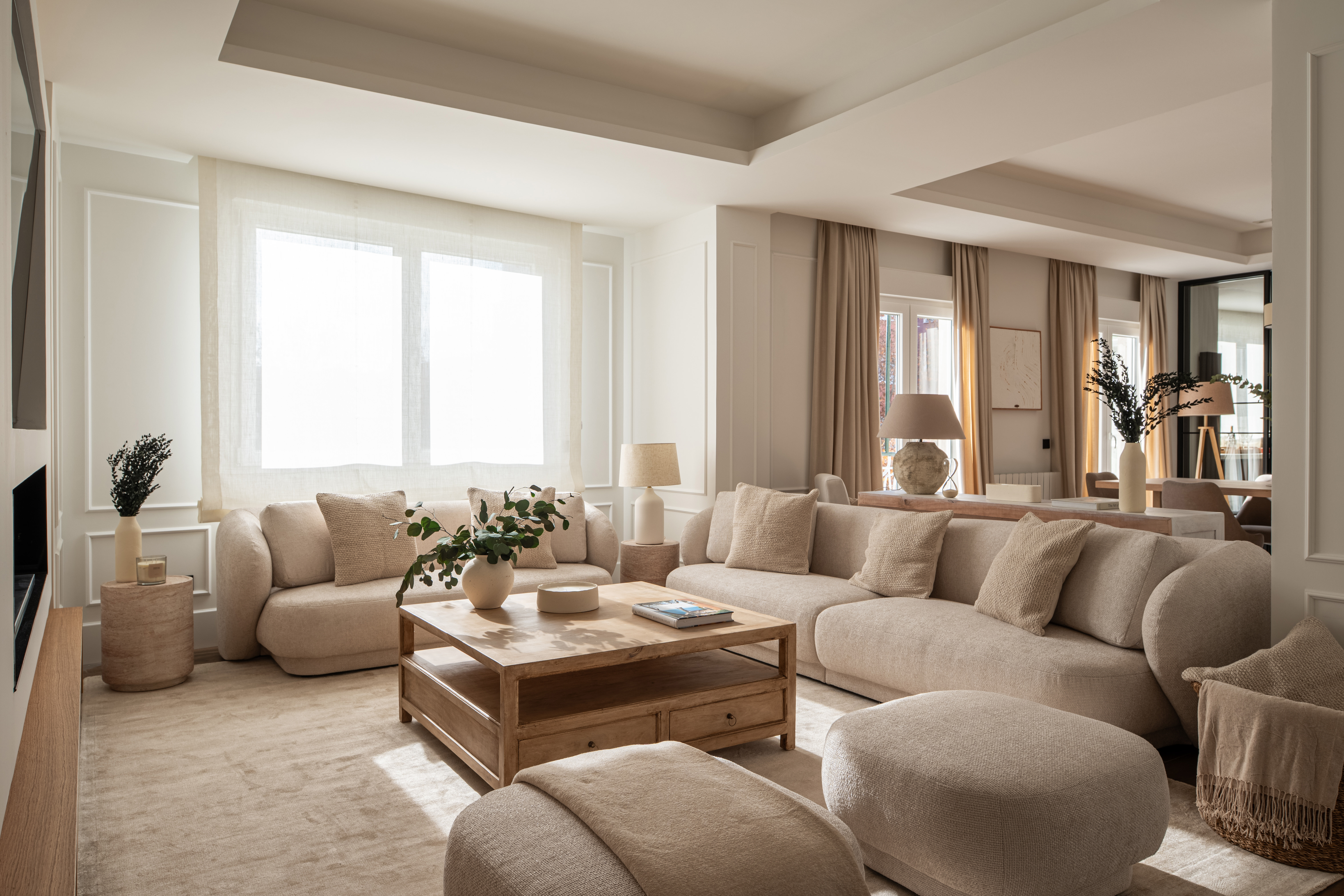 exterior shot add furniture in the picture as in the reference image one sof infront of the tv