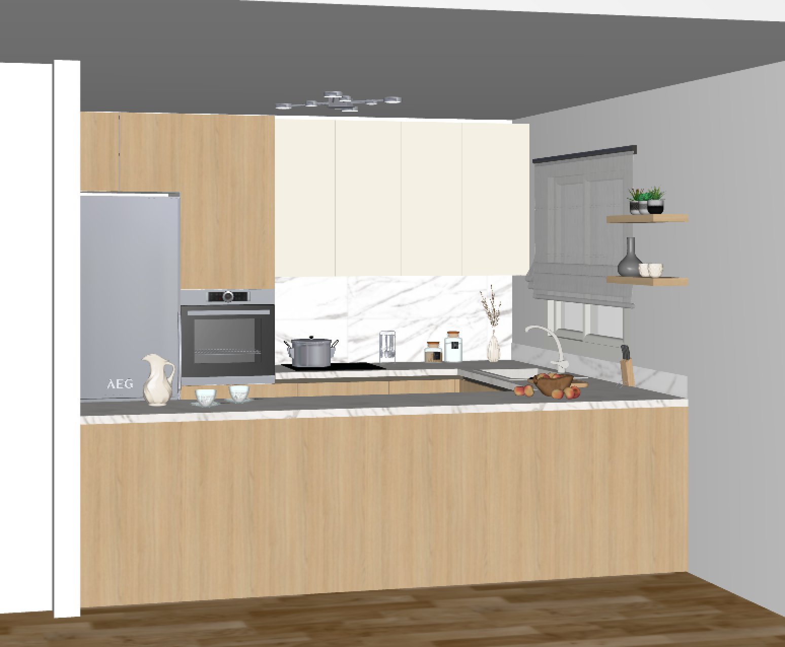 just a 3d render add some lights keep colours as it is the worktop and backsplash will be neolith calacatta gold silk