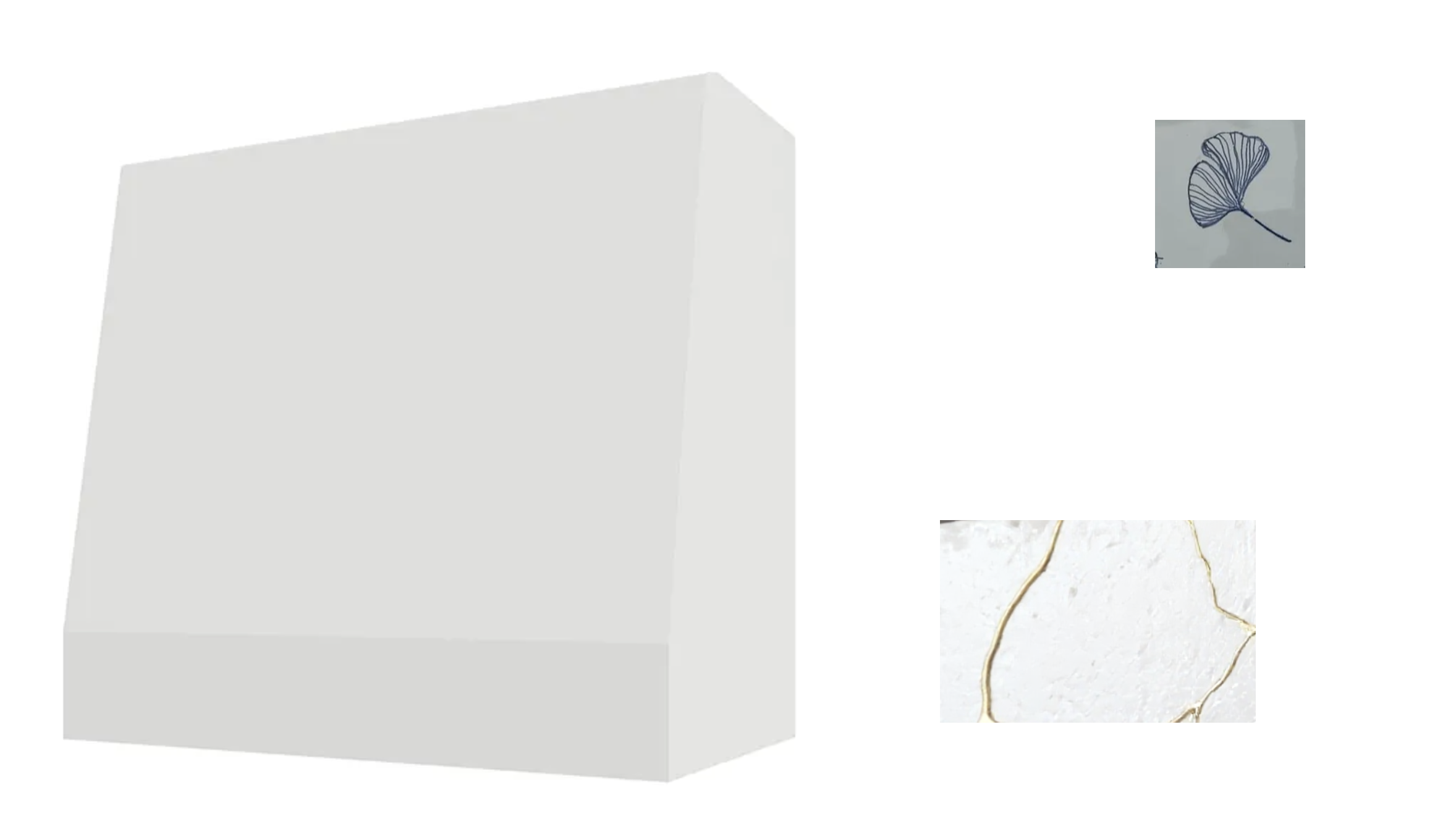 take the image on the left and render it with some handpainted blue and white details in 3 areas from the image on the top right then add gold paint placed sinulously around the entire kitchen hood but keep the background white