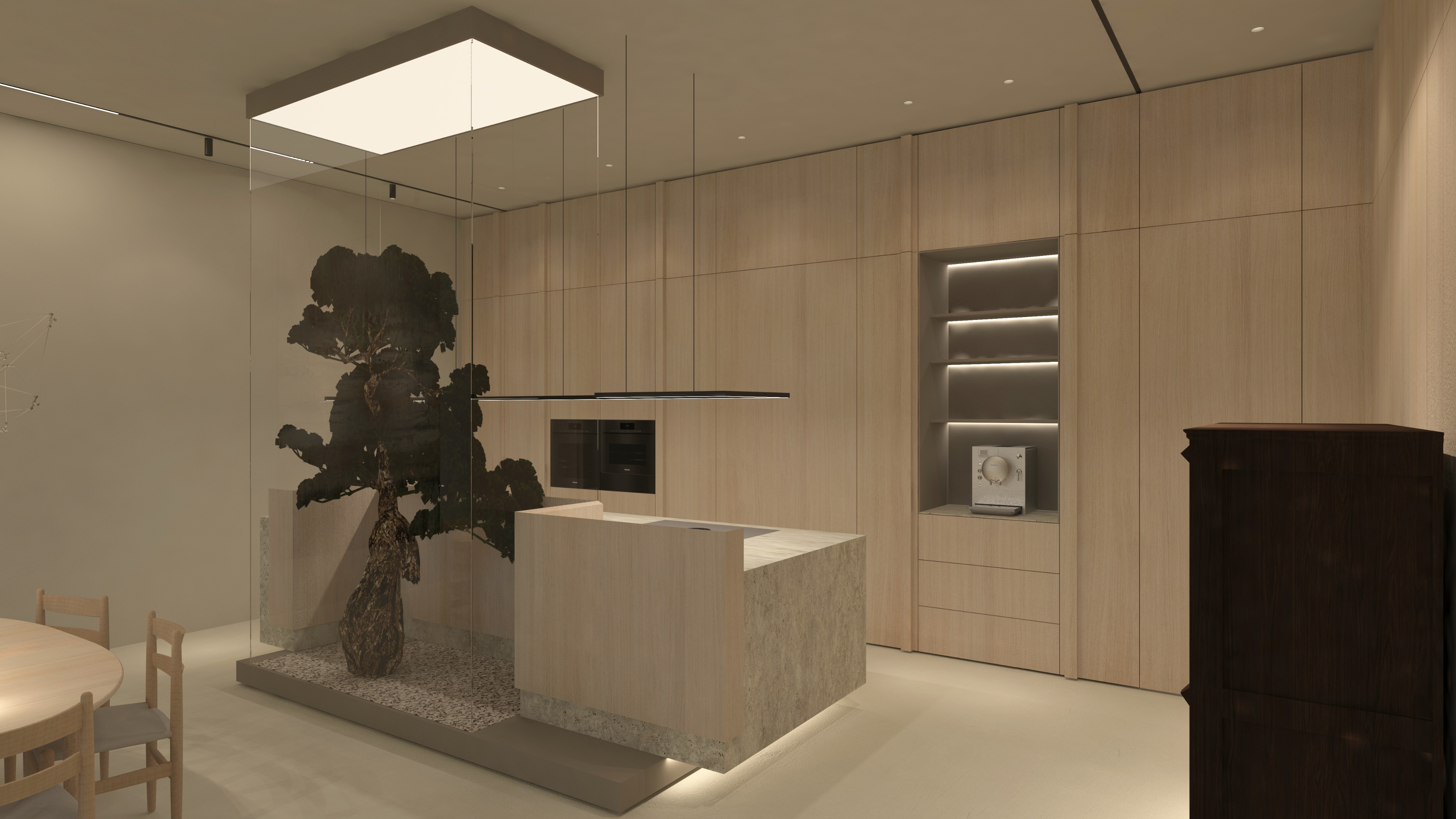 render a modern minimalist kitchen with an elegant and serene atmosphere the color scheme includes soft whites and grays for the walls and cabinets accented with natural wood tones on the countertops and trim the center island has a sleek polished concrete texture the floor is a smooth dark slate gray contrasting beautifully with the light colored walls use diffused ambient lighting to create a cozy yet sophisticated atmosphere with sunlight streaming through a skylight to enhance the serene ambiance include stainless steel elements for the appliances and fixtures adding a touch of modernity