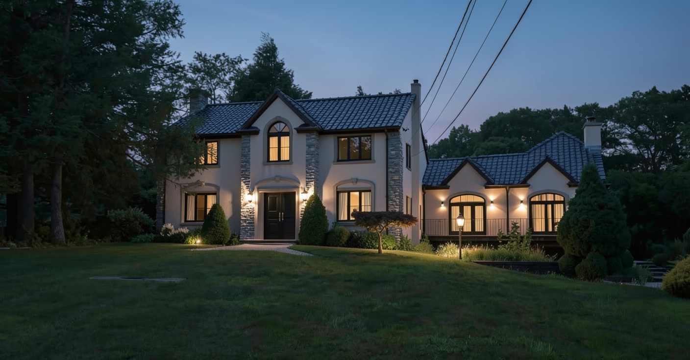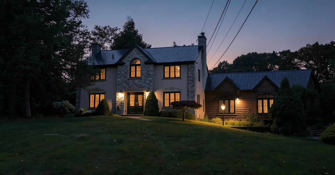 grey roof grey stacked stone accents black framed windows exterior lighting dusk dark grey hardie plank siding