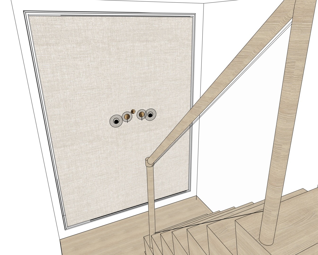 create a detailed interior design for a modern staircase with a minimalist design a soft textured white wall creates a warm and welcoming atmosphere the wall features matching moldings the stairs are crafted from light oak highlighting the natural grain and smooth finish an elegant handrail complements the light oak stairs the light fixtures are small round and metal with touches of bronze and silver creating a subtle contrast the interior is bright and airy with natural daylight casting delicate shadows and highlighting textures