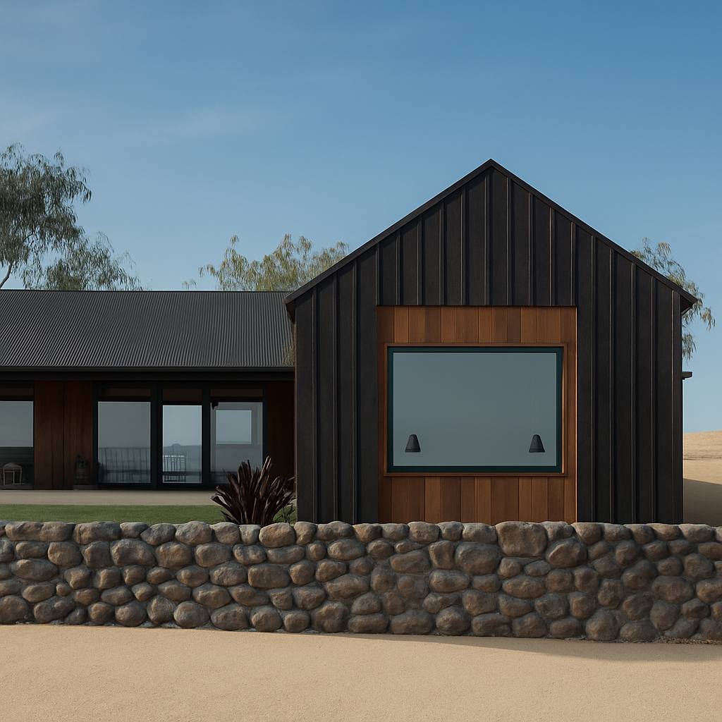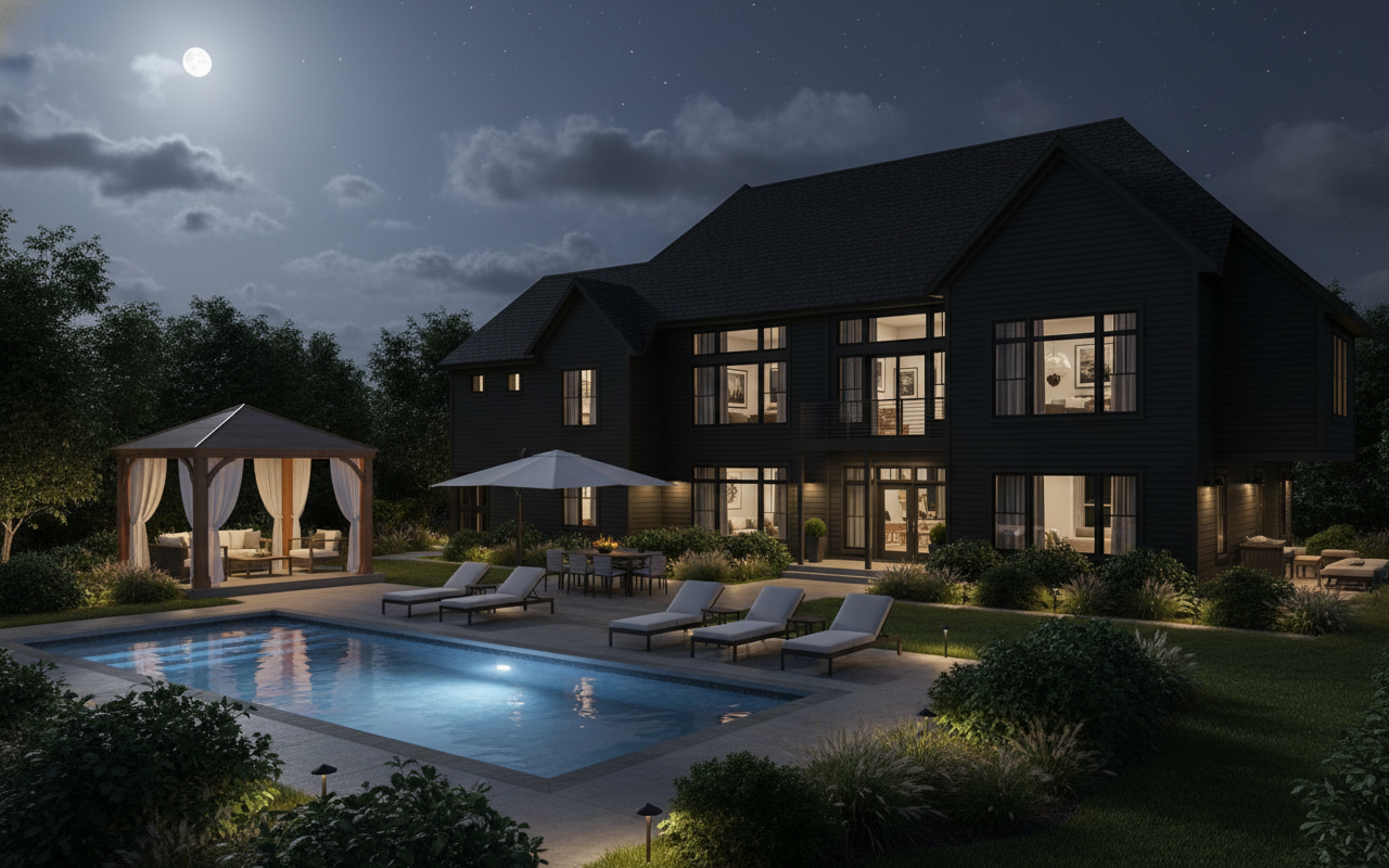 must add a riverpools x36 model pool cedar gazebo with curtains add outdoor furniture make the siding black paint colored no stone or brick on the house black windows do not change the layout add landscaping zoom out far to show landscaping and house make the deck all brushed concrete not too much concrete add dining table and chairs add lounge chairs and a white umbrella no steps put the gazebo to the left make it look fancy show it at twilight with outdoor lighting