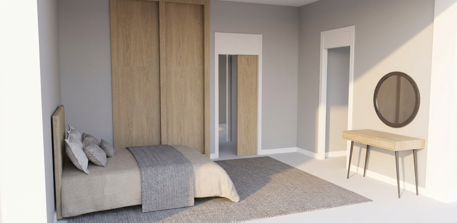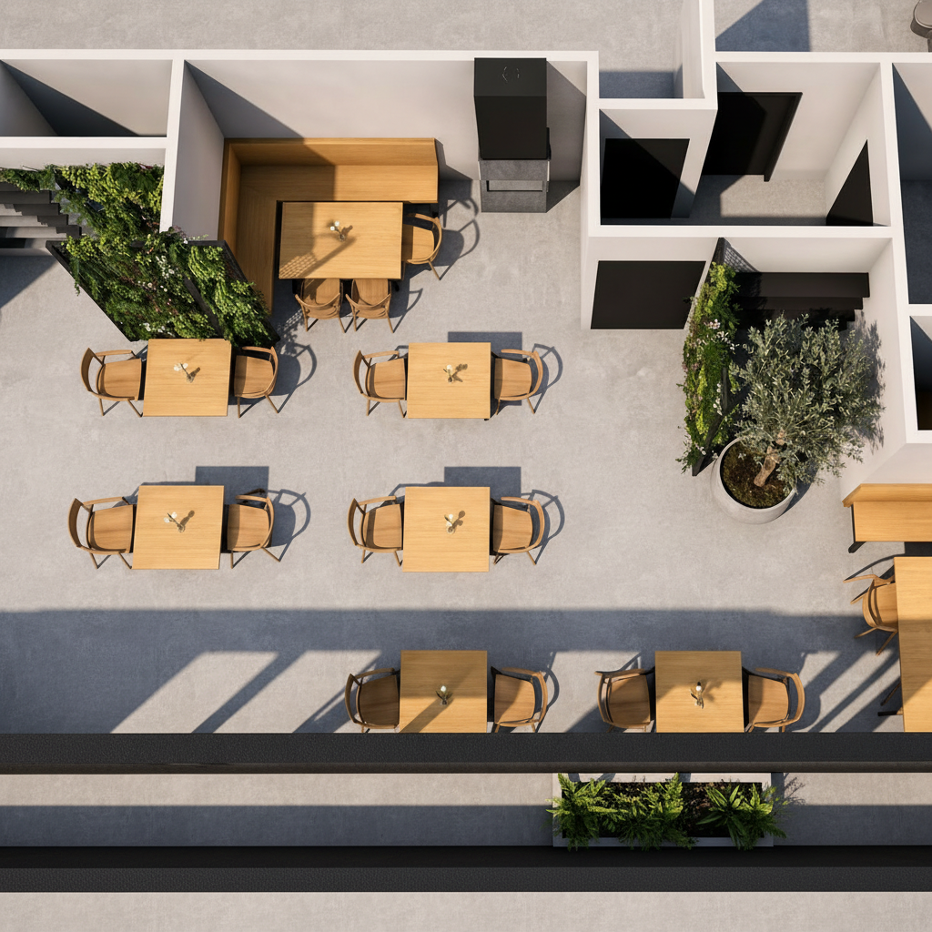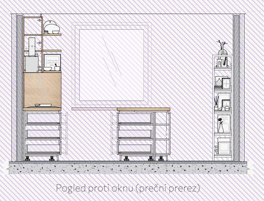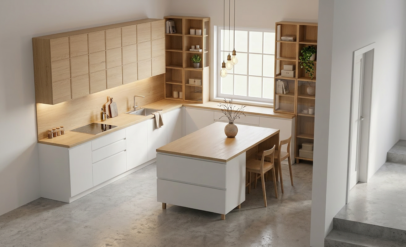 convert this floor plan into a realistic isometric 3d view of a full house show the space from an elevated angle with furniture walls and details visible on the picture there is elevation of the kitchen create a 3d realistic render of the kitchen add realistic lightning and accessories the counter top and upper cabinets are oak cover all other fronts are white also the walls are white the backsplash in also oak the wood is light make it feel homey maintain precision use the same furniture as shows on the plan do not change the orientation of the floorplan