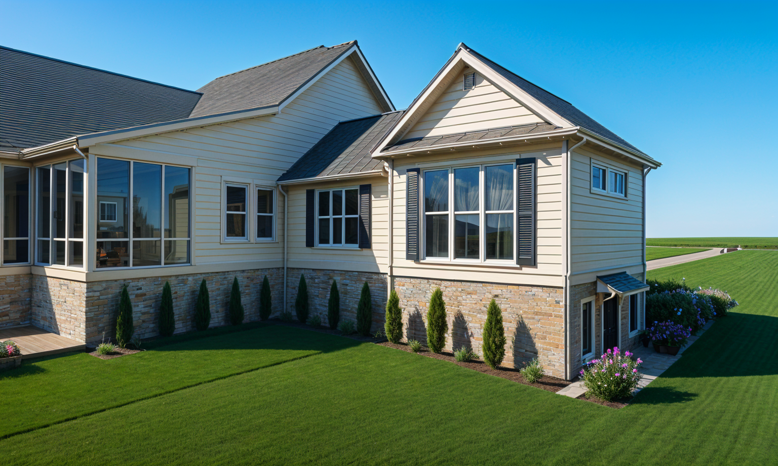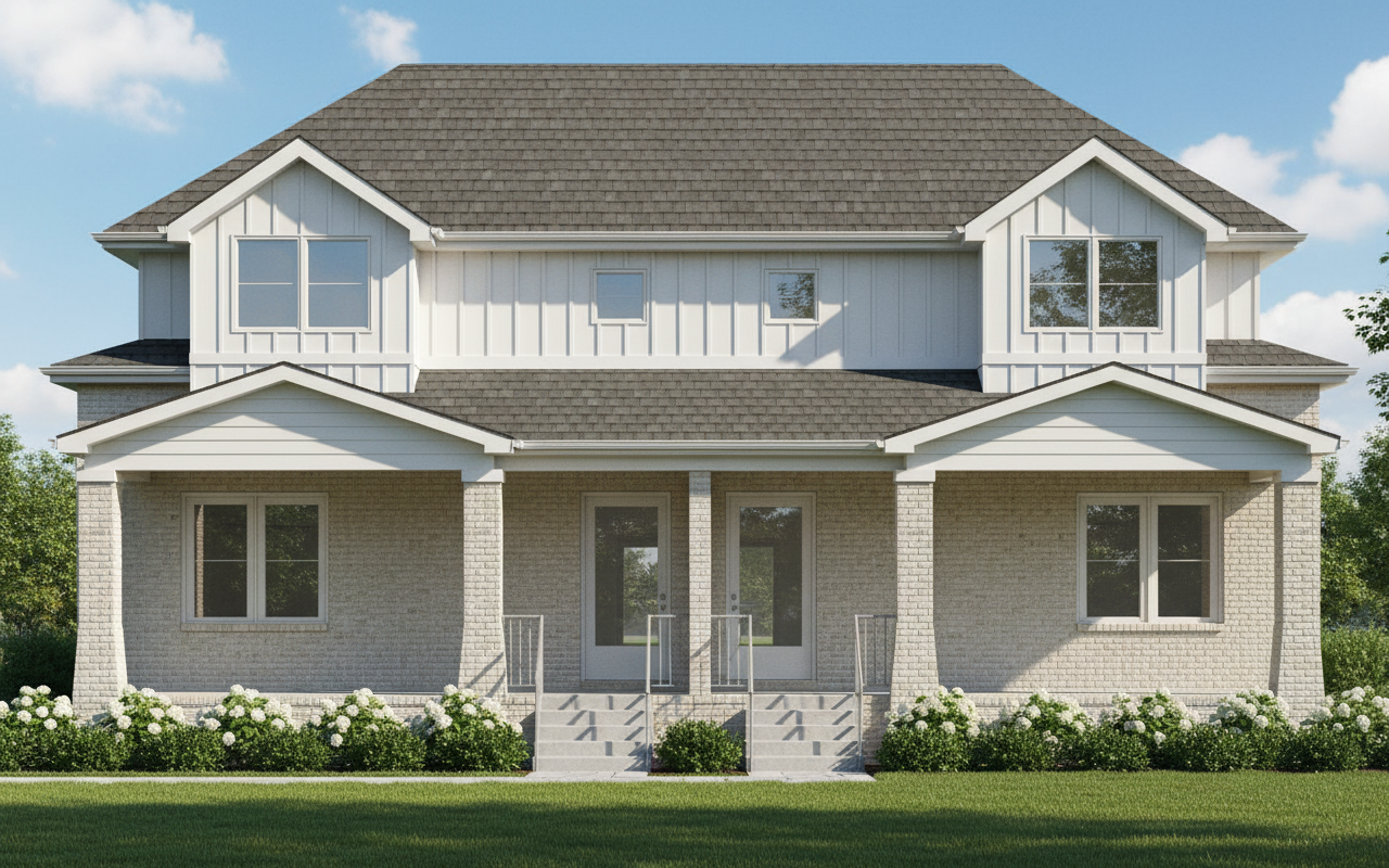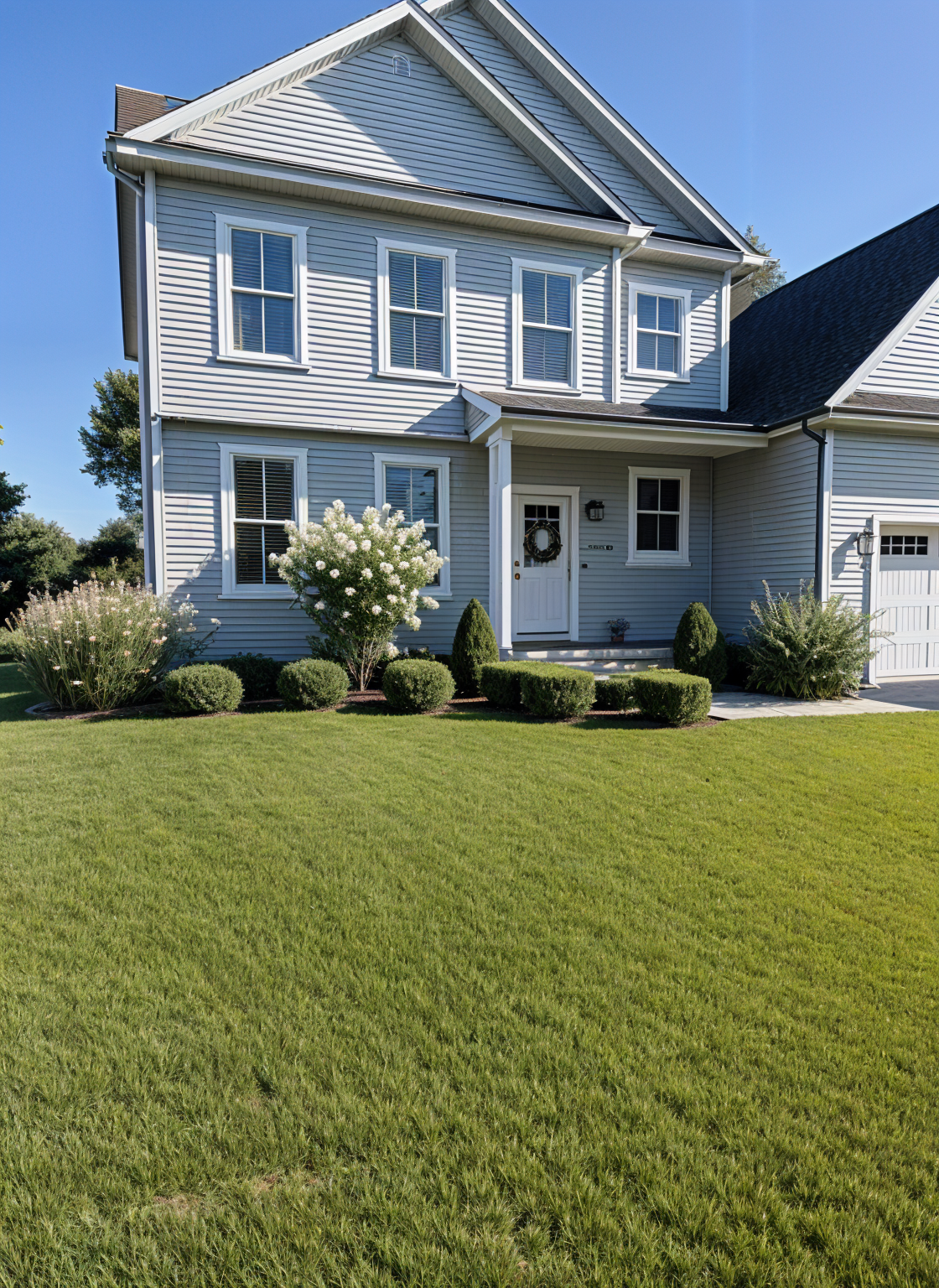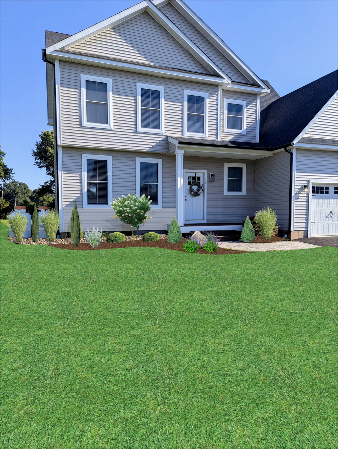 a manicured lawn planted landscape bed with hydrangea tree close to foundation between windows purple salvua around stone boulder left of walkway and cayopteris to left of hydrangea tree two 150 gallon propane tanks left side of house screened by miscanthus grass