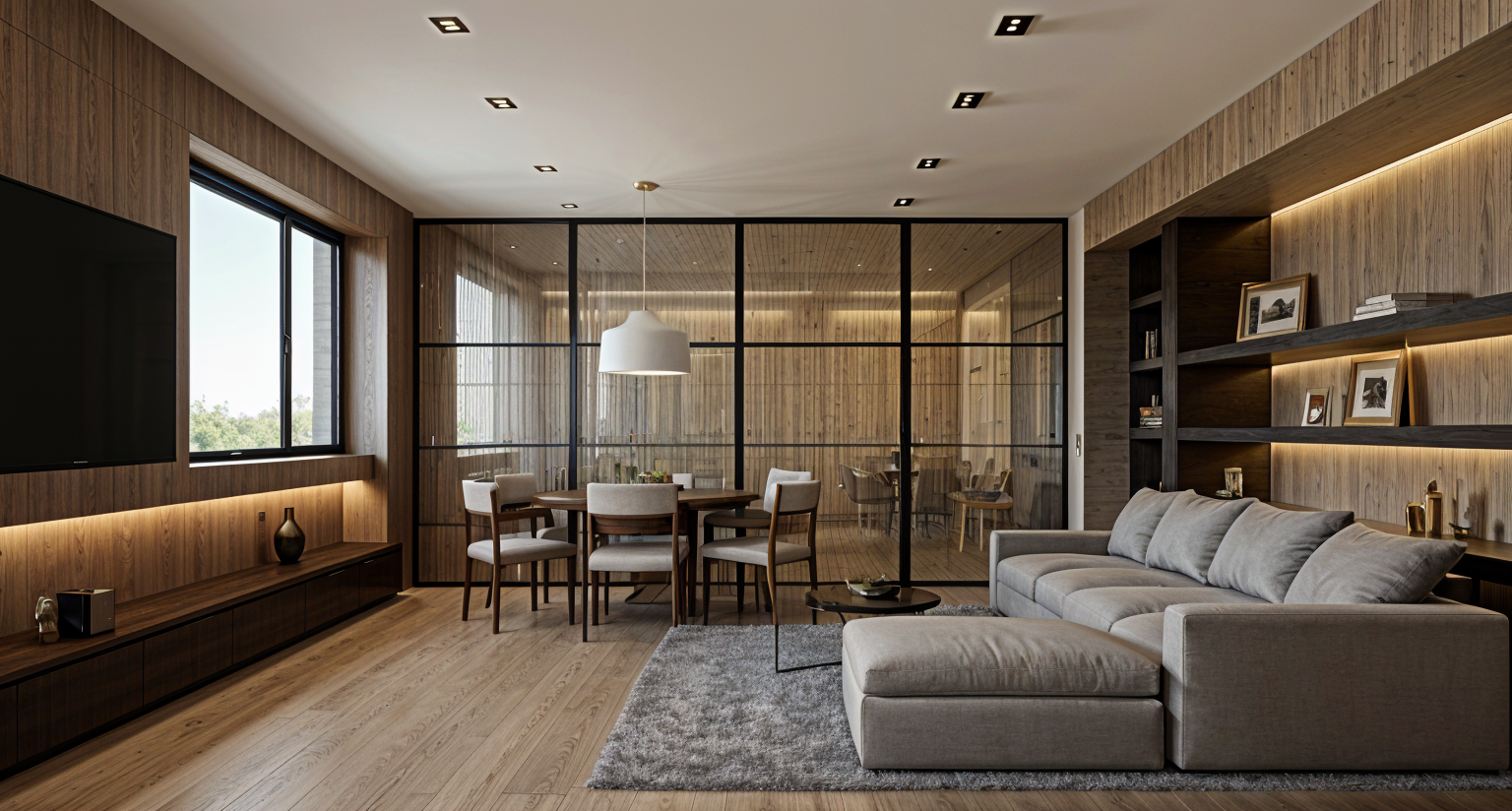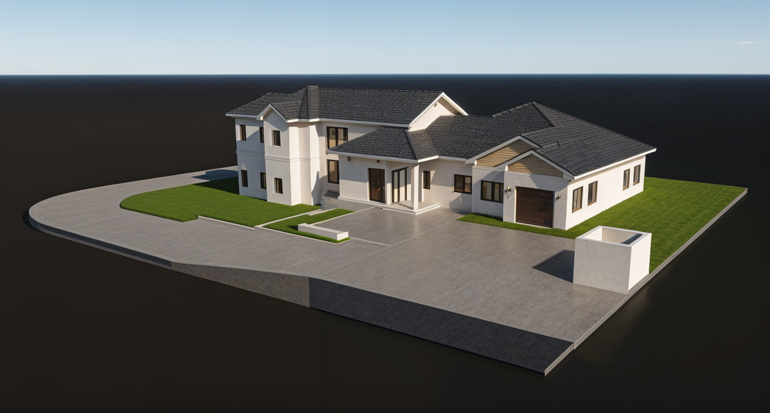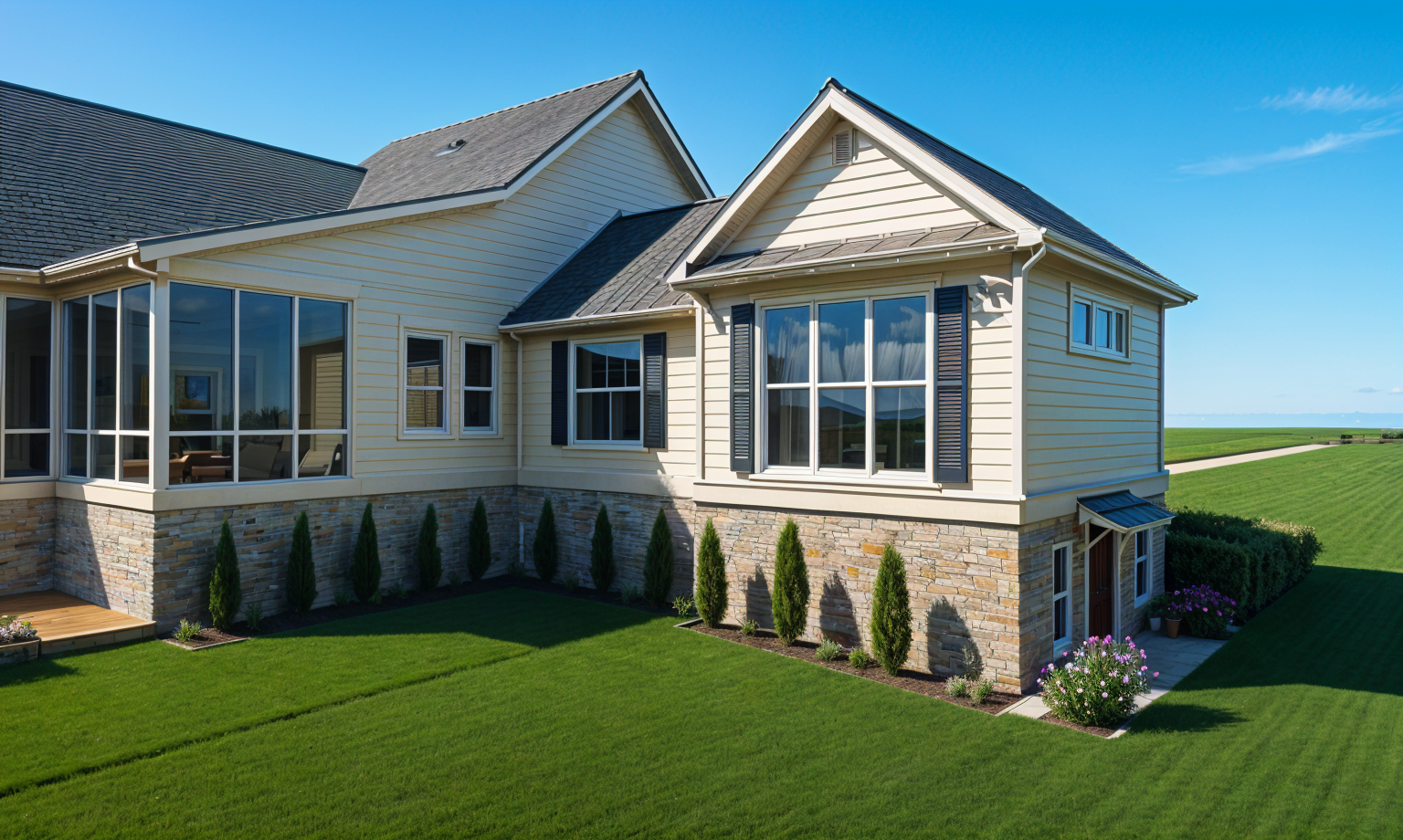 a manicured lawn planted landscape bed with hydrangea tree close to foundation between windows purple salvua around stone boulder left of walkway and cayopteris to left of hydrangea tree two 150 gallon propane tanks left side of house screened by miscanthus grass