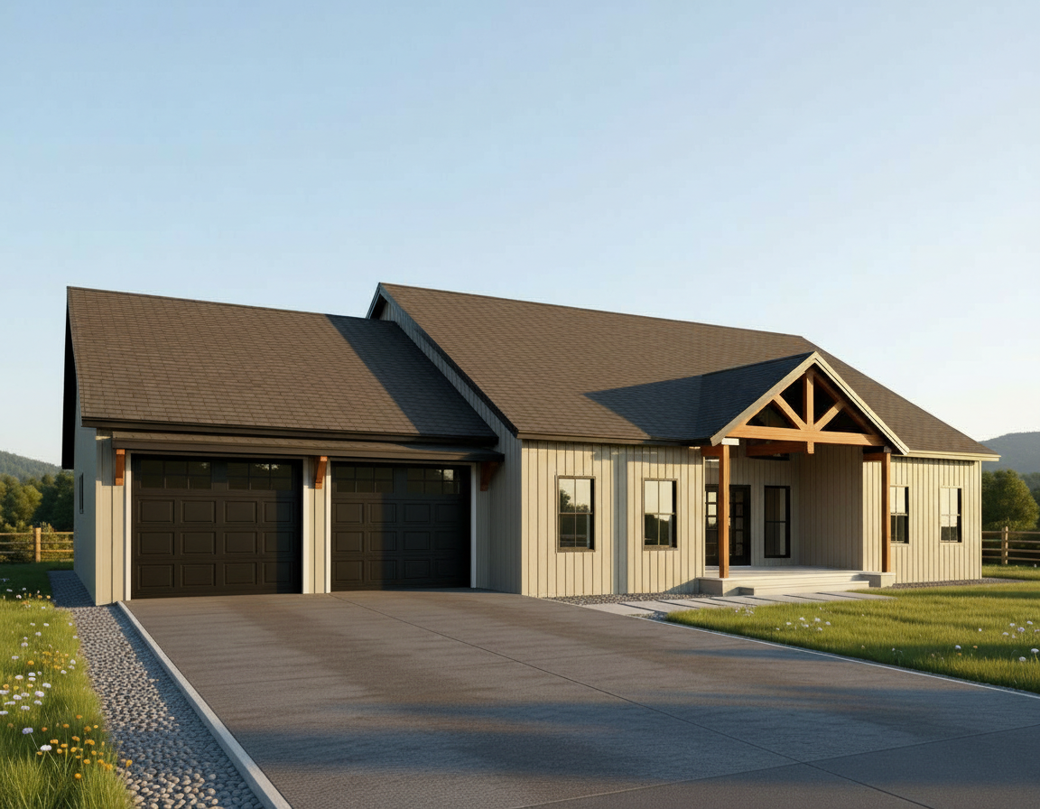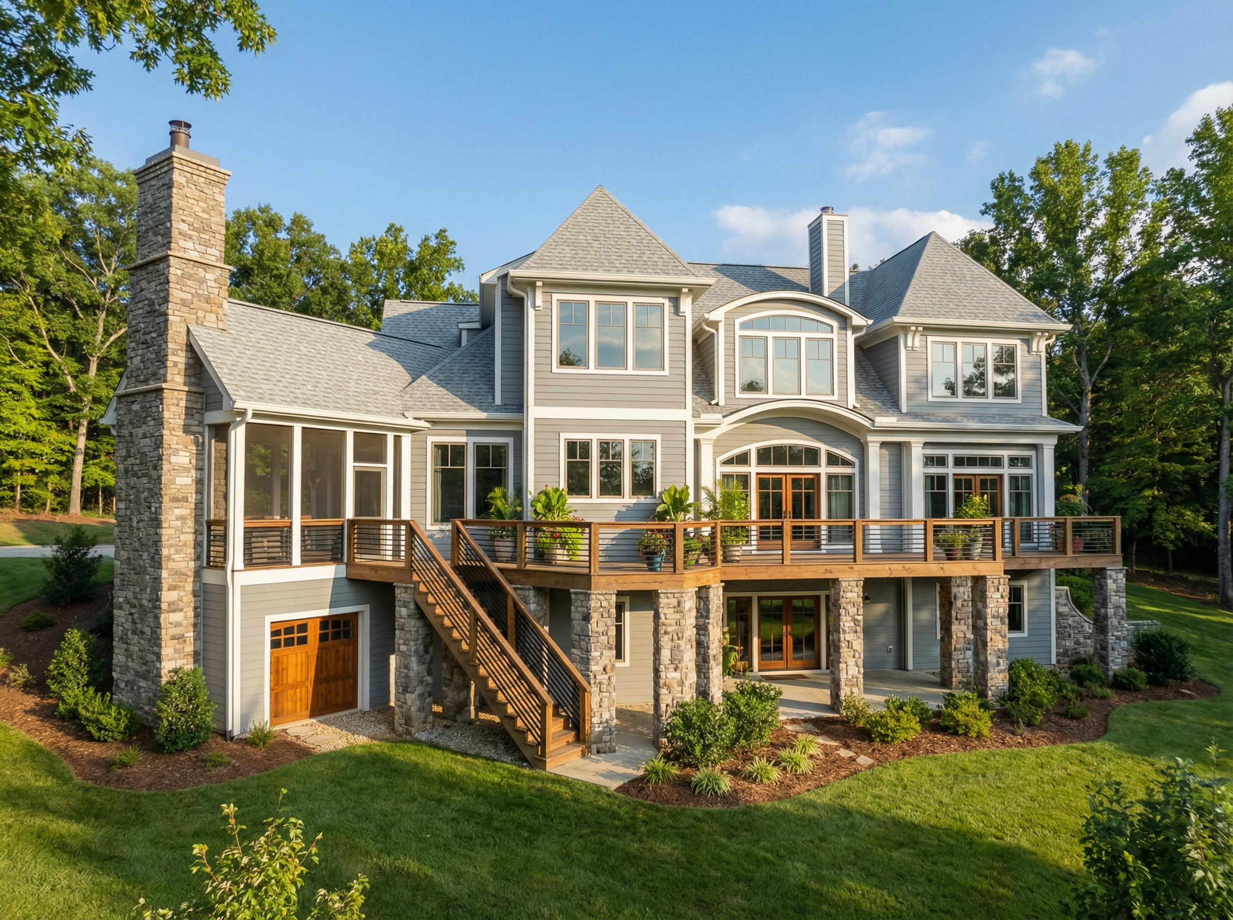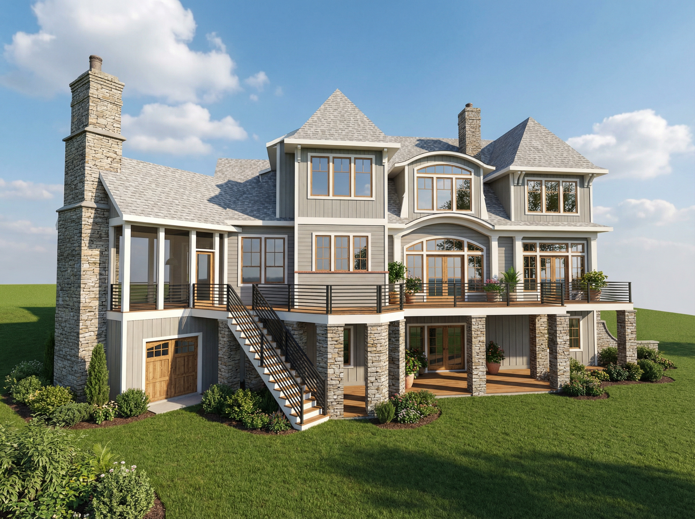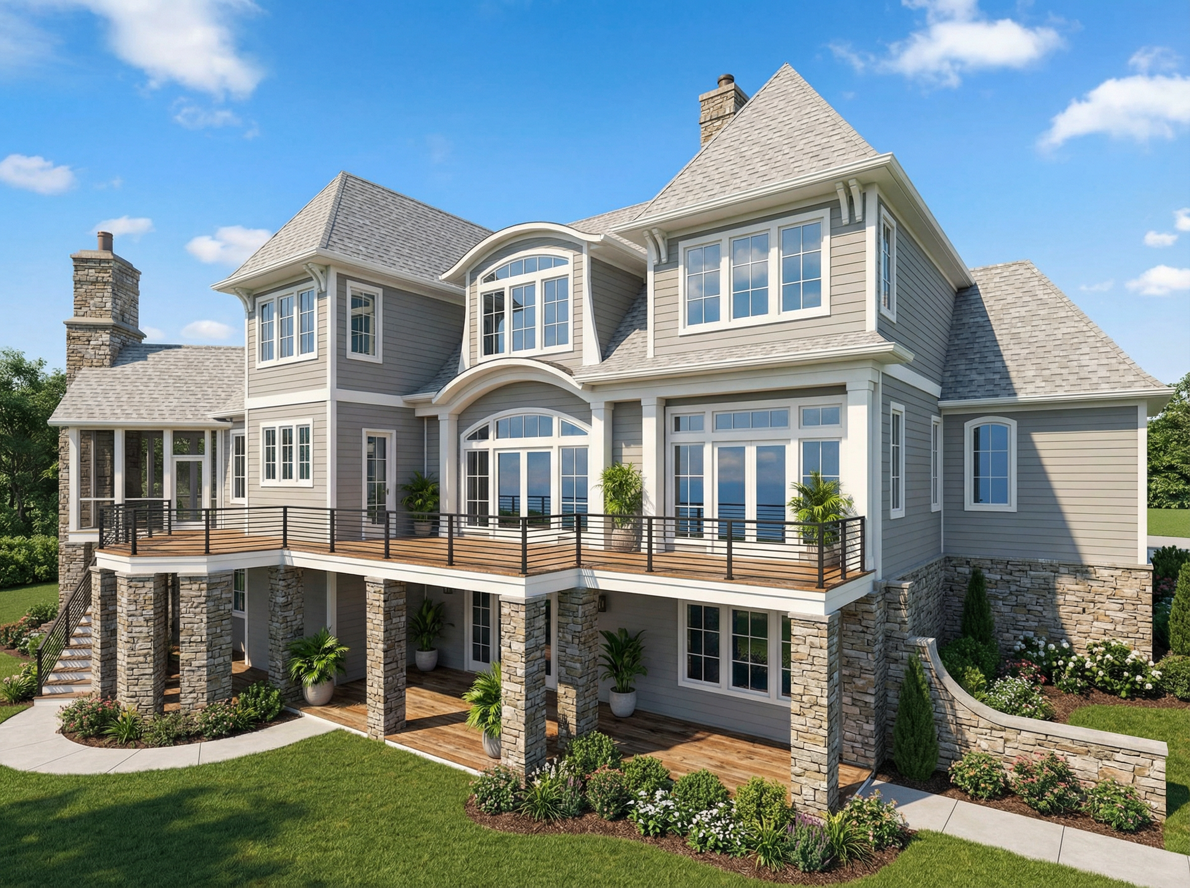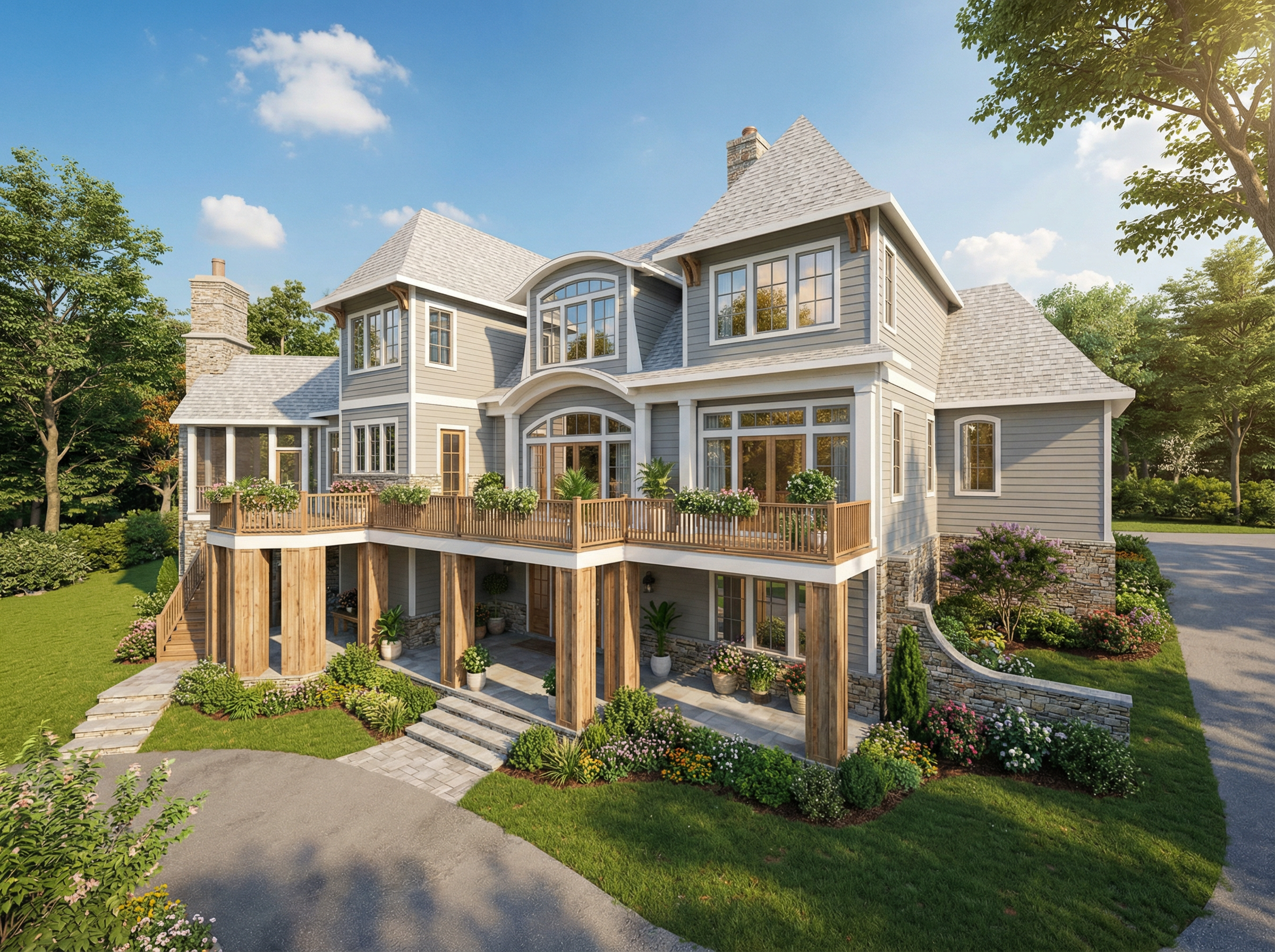 render a charming cozy house in a peaceful neighborhood setting the house exterior features soft gray walls with white trim and a rustic wooden porch the roof is a light gray shingle add natural sunlight casting gentle shadows for a warm atmosphere the windows are reflective suggesting a sunny day the backdrop is a clear blue sky with a hint of fluffy clouds the porch is decorated with potted plants adding splashes of green overall the scene exudes a serene and welcoming vibe make columns stone to match railings will be black horixontal add trees in background