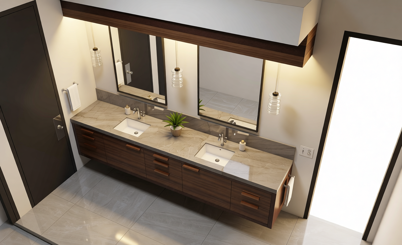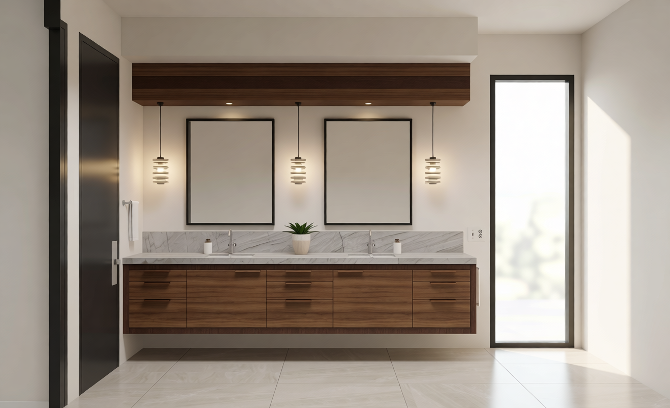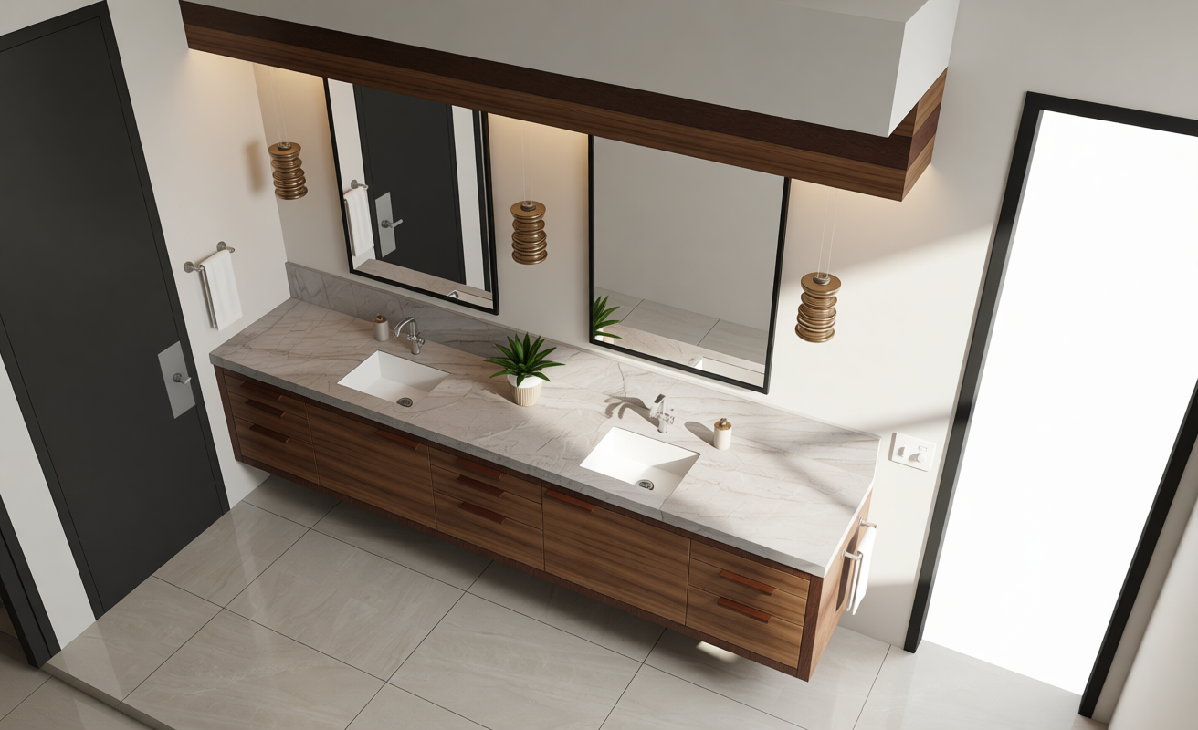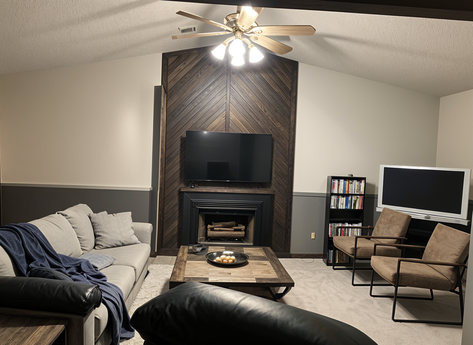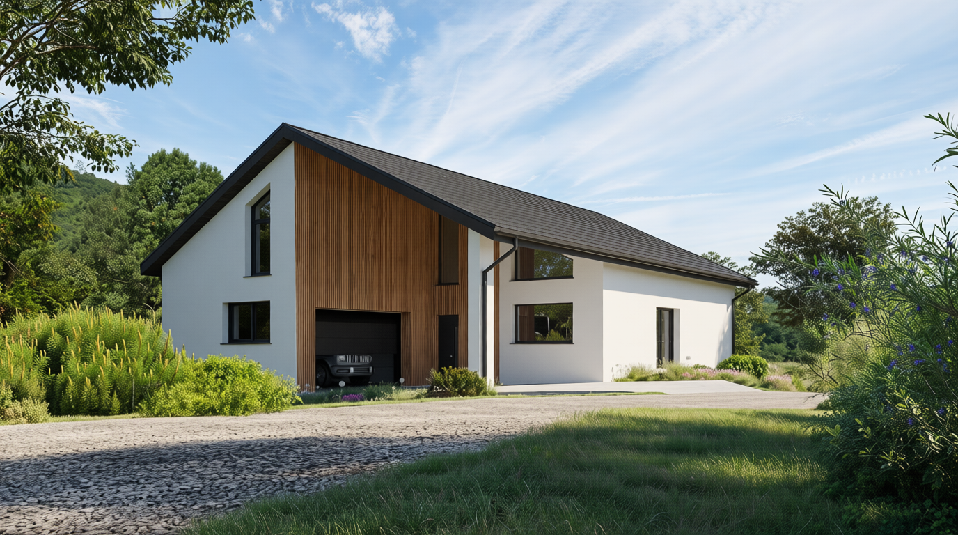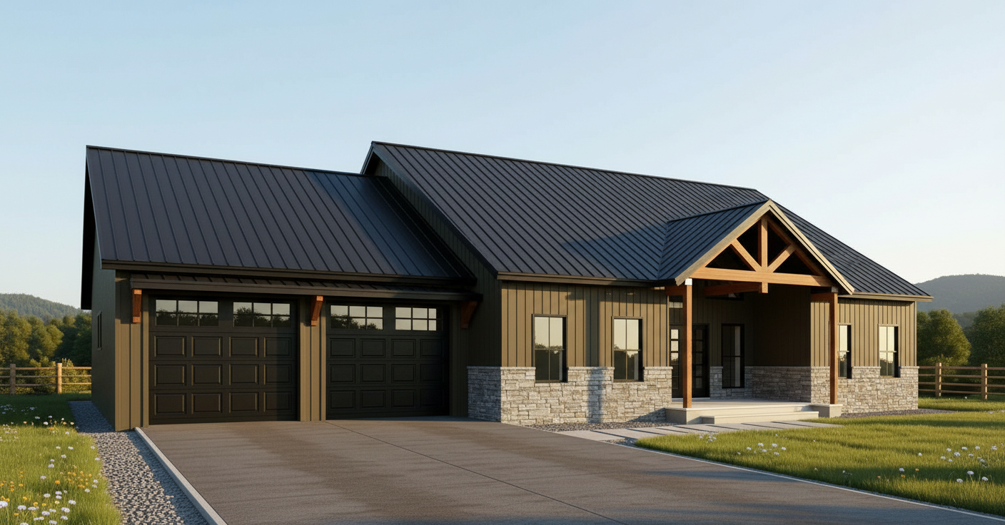 render a charming cozy house in a peaceful neighborhood setting the house exterior features soft gray walls with white trim and a rustic wooden porch the roof is a light gray shingle add natural sunlight casting gentle shadows for a warm atmosphere the windows are reflective suggesting a sunny day the backdrop is a clear blue sky with a hint of fluffy clouds the porch is decorated with potted plants adding splashes of green overall the scene exudes a serene and welcoming vibe make columns stone to match railings will be black horixontal add trees in background