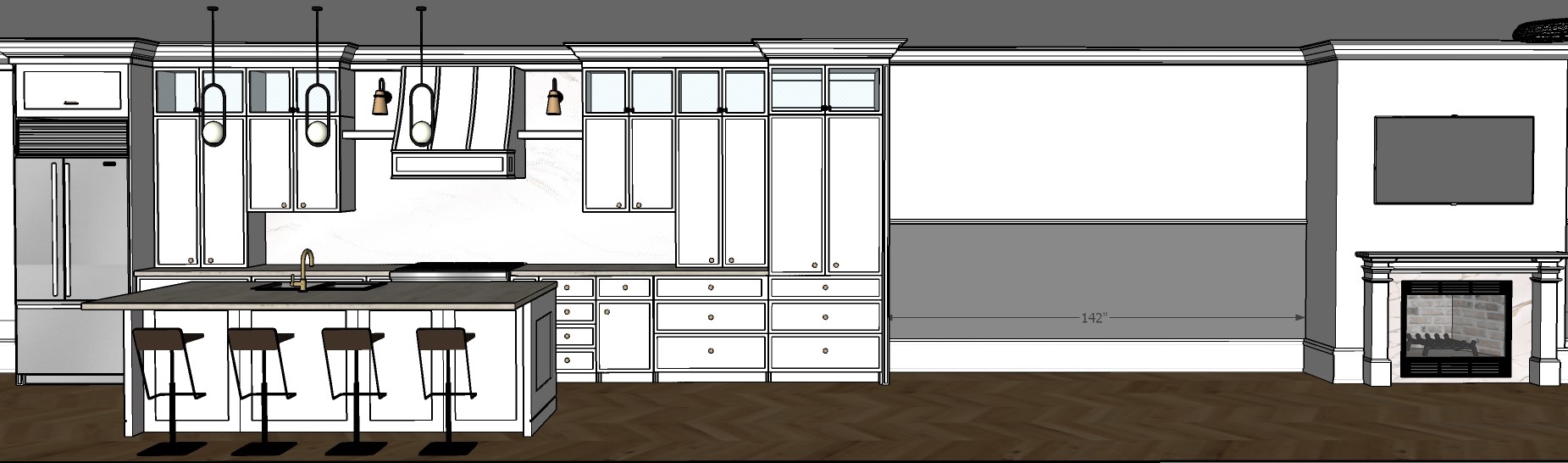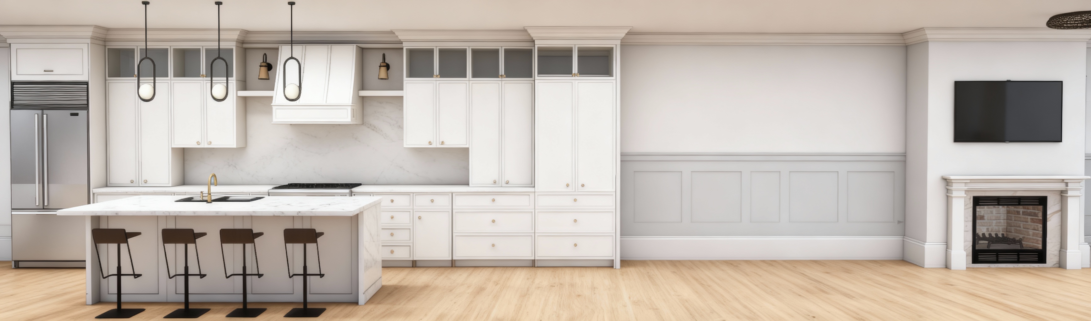 render it with the wall paneling on the fireplace white color wall the backsplash is white marble island countertop is also white marble flooring is light oak texture paint the wall paneling to light grey wall paneling is shiplap only on the grey area shiplap is in vertical direction lighting in the cabinet glass gox