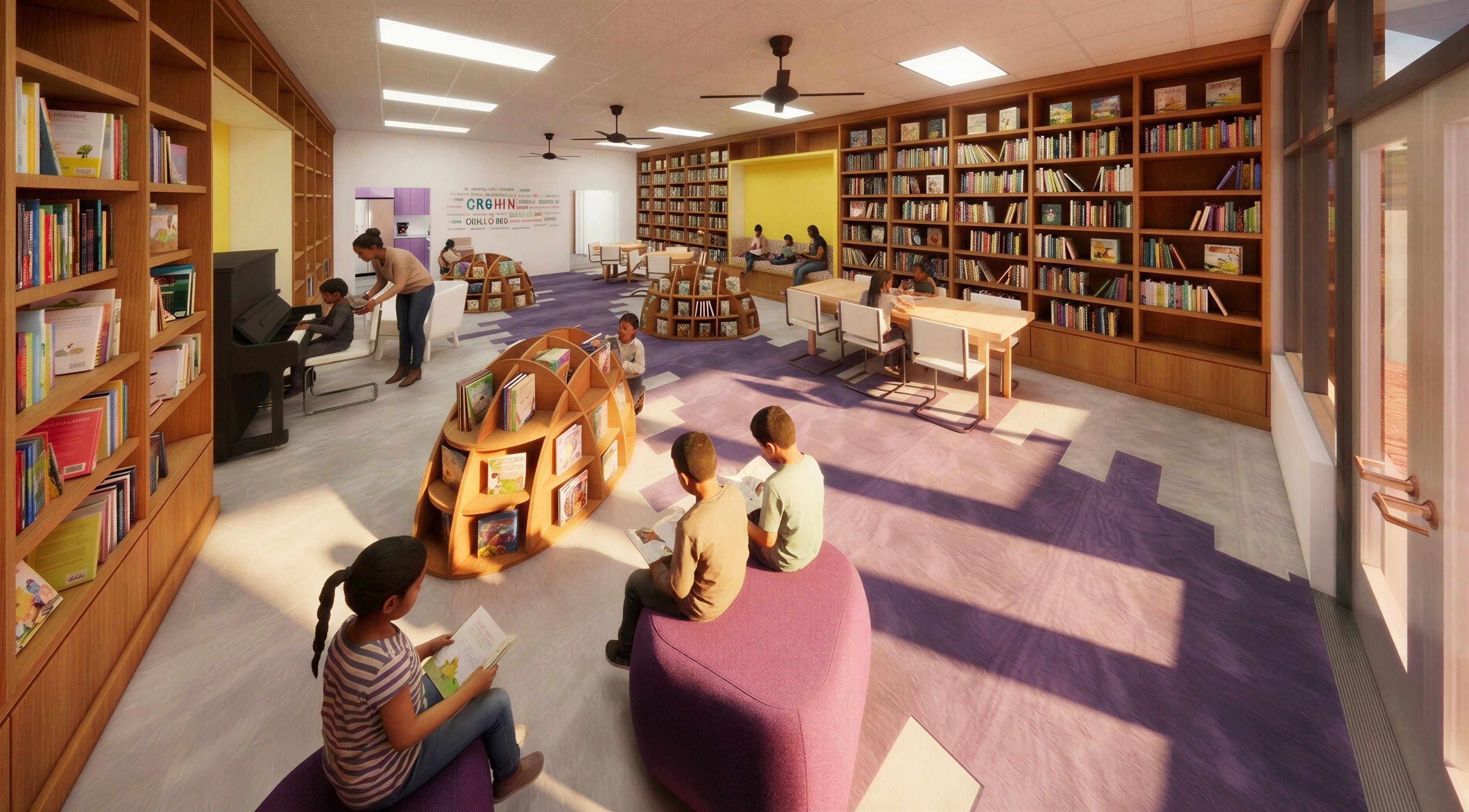 keep the floor pattern but make it look more like lvt add vegetation to the tables add 2 more kids standing and reading