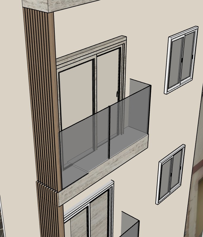 ultra realistic architectural render of the provided sketchup balcony detail this is a strict image to image enhancement preserve the exact geometry proportions and design from the sketchup model critical geometry instruction the window door must remain flush with the main facade wall the balcony must project outward from the facade no recessed balcony no niche no inset wall maintain exact spatial relationship flat facade plane door aligned with facade balcony slab extending outward in front of the facade material specification facade smooth painted masonry in light warm beige tone balcony slab bottom edge only thin travertine strip light beige side element vertical wooden slats light wood tone railing clear glass balustrade minimal fixings material realism plaster smooth and clean no recess shadows travertine thin and precise wood slats slim and evenly spaced glass highly transparent with realistic reflections important constraints do not create recesses or depth behind the balcony do not move the window inward do not reinterpret geometry lighting soft natural daylight realistic shadows under the projecting balcony rendering style high end photorealistic architectural detail clean and precise critical instruction this is a projecting balcony with a flush facade no recessed design