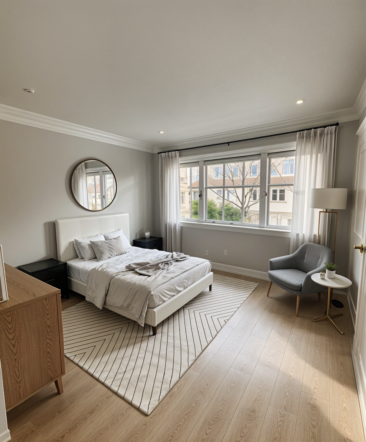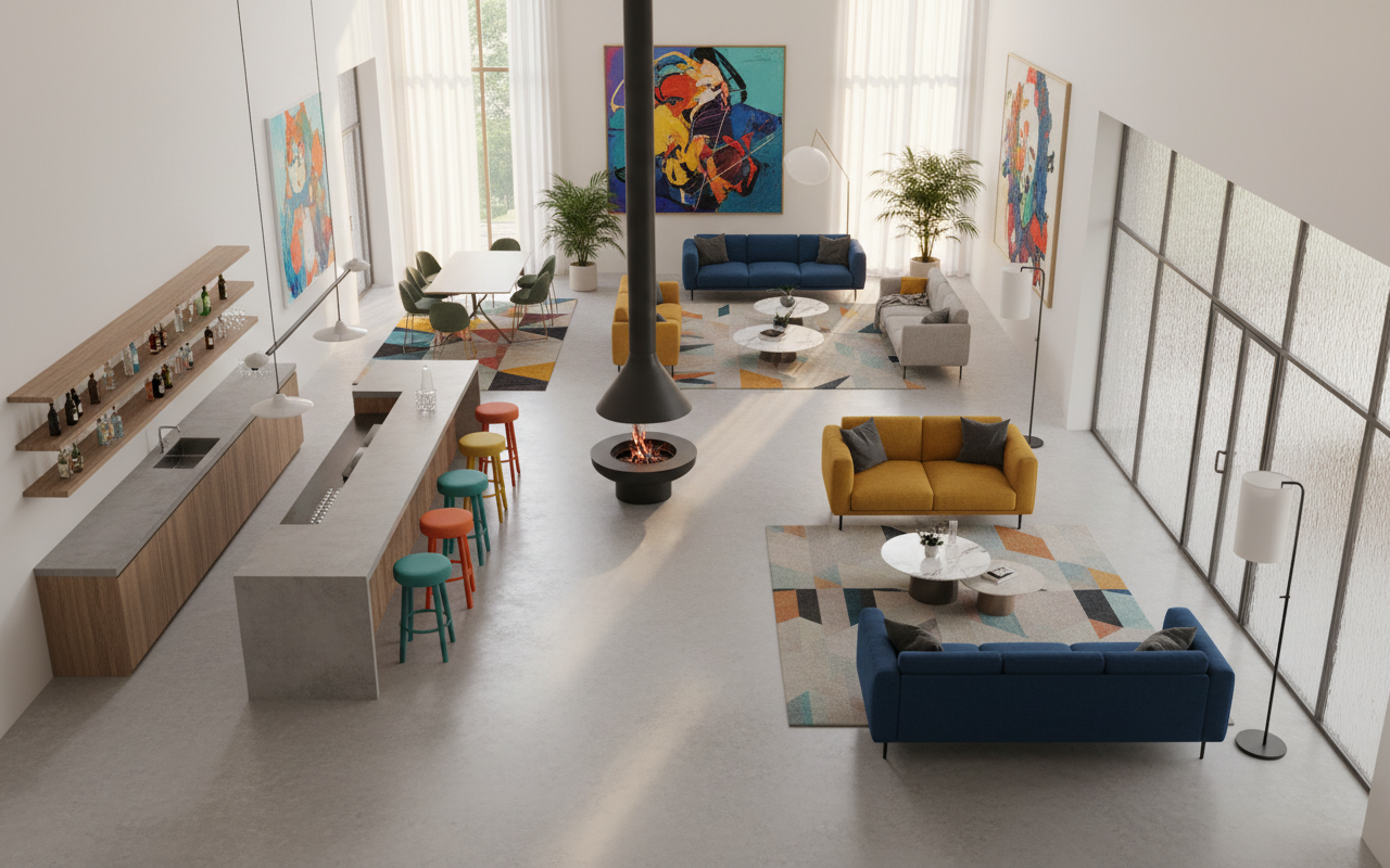 generate a photo realistic floor plan without shadows the floor tiles are charcoal the benches are blonde aspen wood