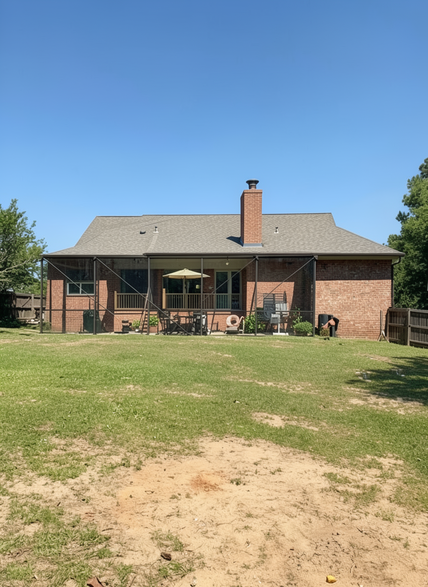 change the sky to a soft vibrant sunset the house is lit with subtle warm temp lighting maintain realistic subtle pink wispy sky