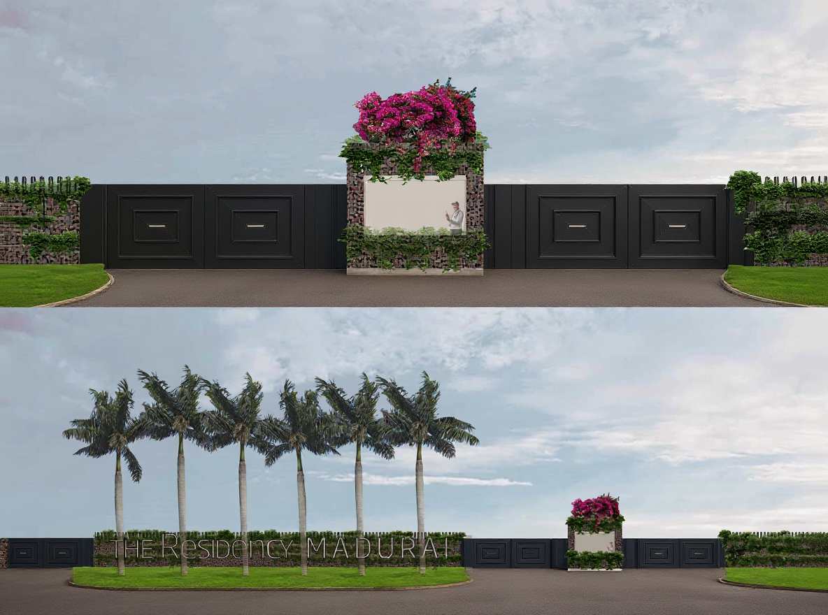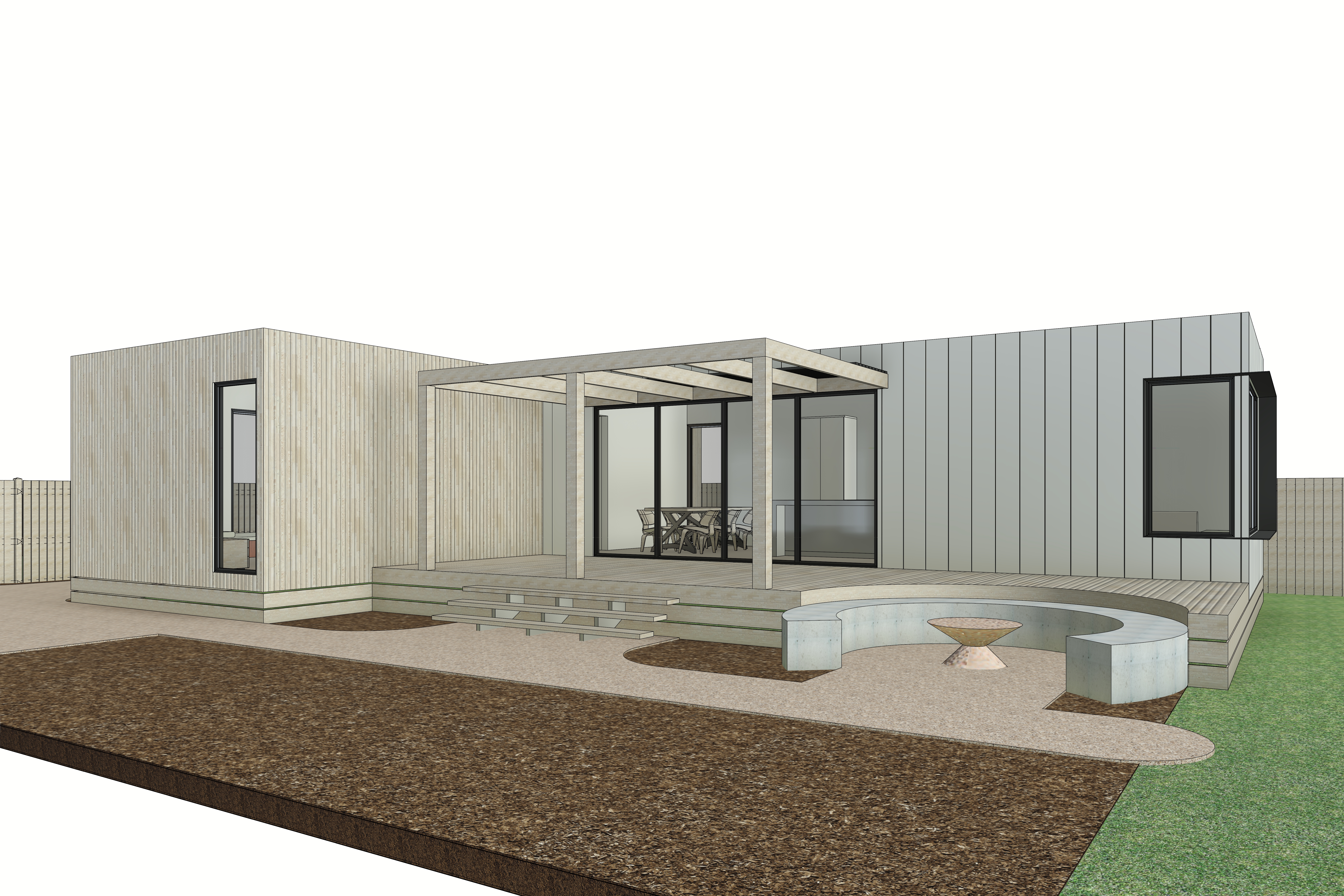 render a modern minimalist house with a sleek modular design the exterior features vertical light wood paneling in soft beige and cool gray tones highlight the large dark framed windows offering a glimpse into a cozy interior the patio area is adorned with a light wooden pergola casting soft shadows the ground is a mix of light gray concrete and patches of lush green grass decorate the scene with a smooth stone fire pit and a curved concrete bench set the atmosphere during a tranquil sunset with warm golden light enhancing the textures and creating a serene and inviting ambiance