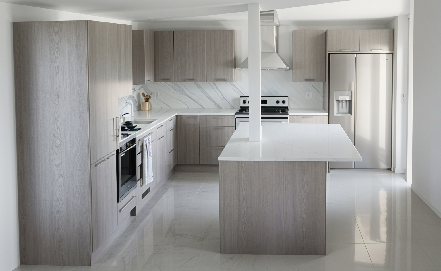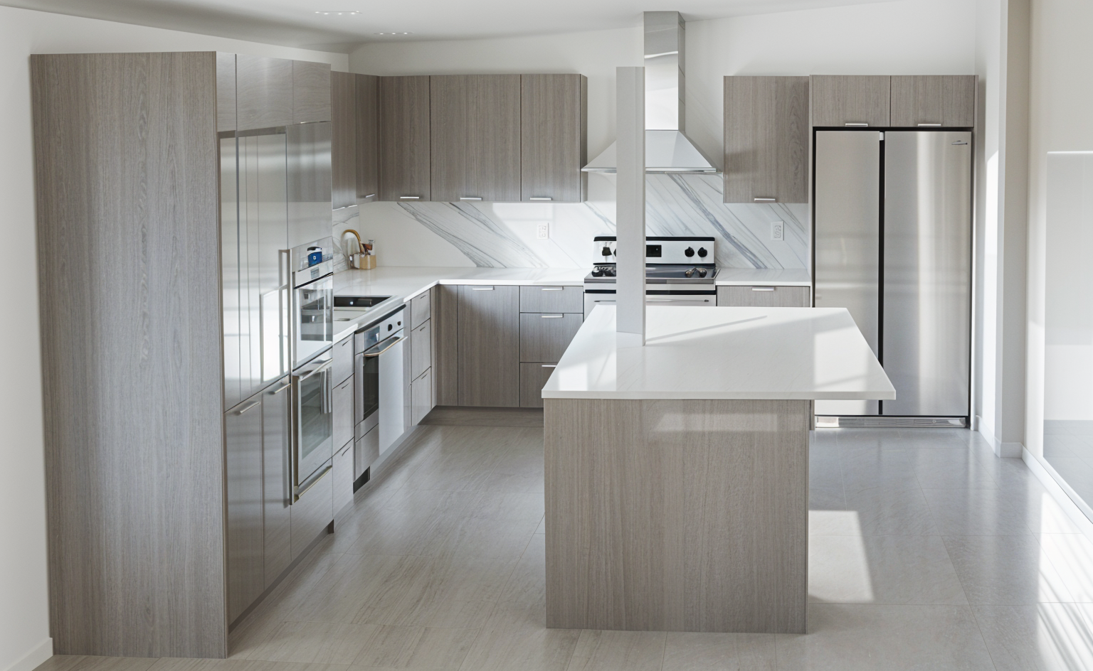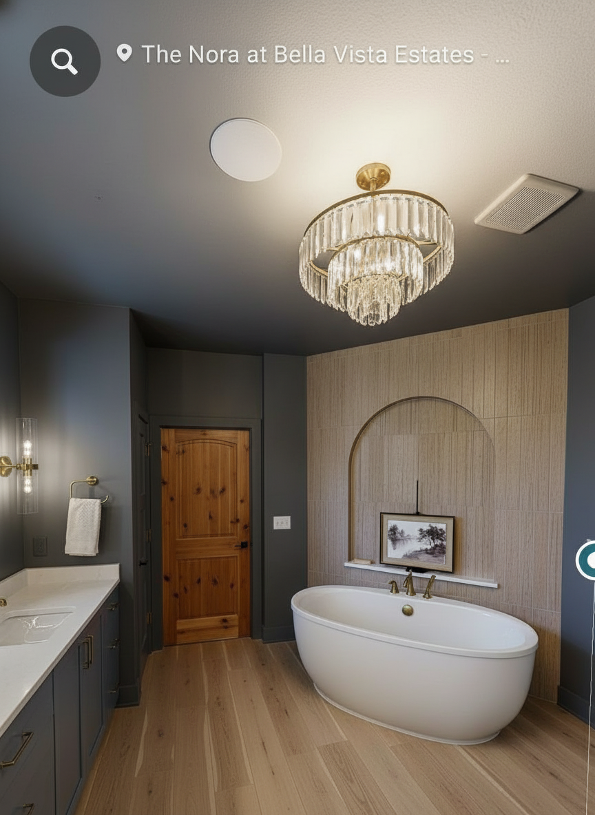 add a closed oak three panel door where the open door is change the wall color to a moody color with the same moody colored trim change the cabinet color to iron ore paint color