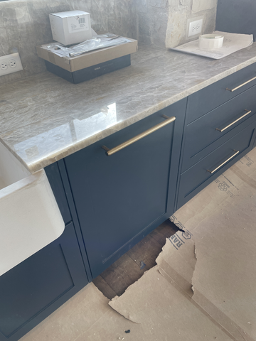 do not change the cabinets in any way preserve the exact cabinet colors materials finishes dimensions door and drawer styles hardware spacing alignment and all geometry exactly as shown do not alter the countertop shape backsplash appliances flooring lighting fixtures or wall structure only remove the construction materials clutter and mess from the scene clean the room and make it look finished and staged add a few simple tasteful home accessories appropriate for the style of the space but do not add or remove any furniture windows or architectural elements maintain the original lighting direction and realism enhance clarity and polish the photo while keeping the cabinetry and room design completely unchanged do not alter the lighting to keep the cabinet colors as they are in the image add new flooring stage the countertop for items near a kitchen sink