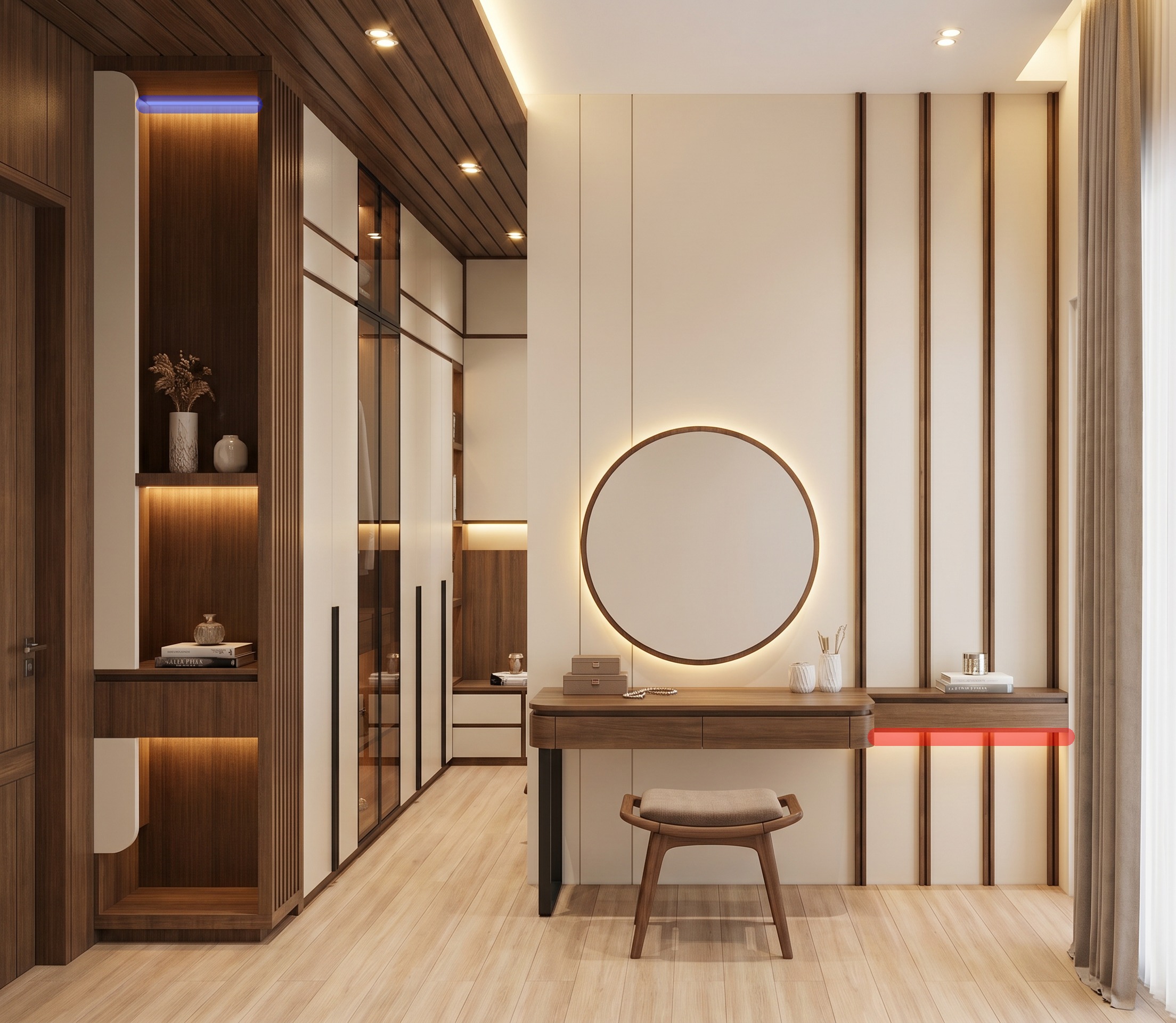 change indirect light with spotlight the blue line part and erase the indirect light under the dressing table the red line part