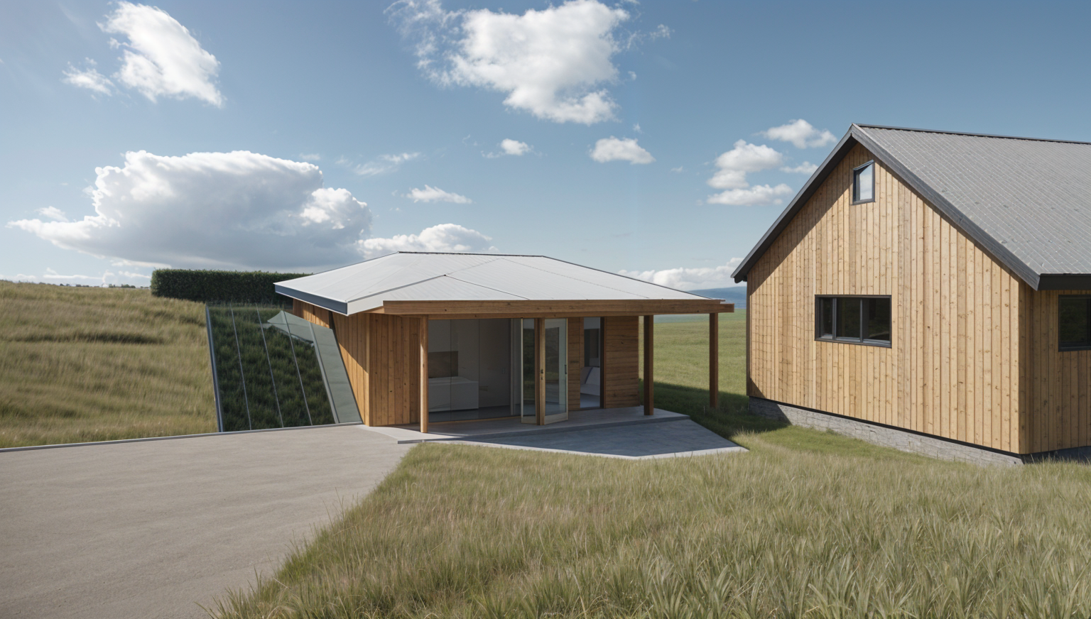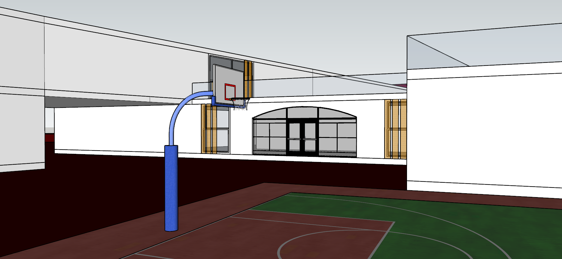 modernist exterior shot render during sunset with a basketball court and grey beige concrete walls and grass on the ground architecture