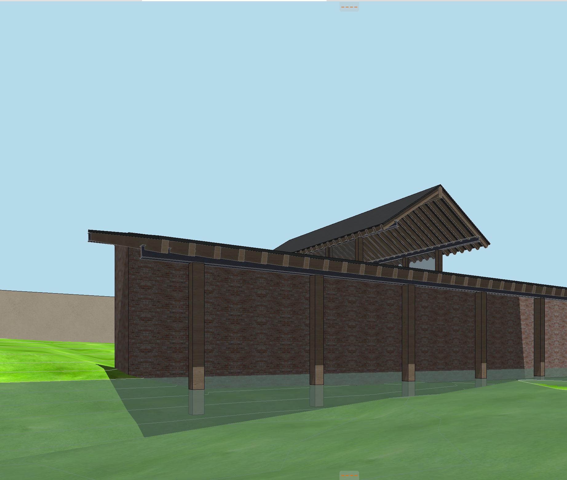 antique brick recalimed pine rafters steel beams reclaimed pine columns lower portion of building to be sitting in the water with boats under the lower roof yellow pine trees in the background clouds in the sky