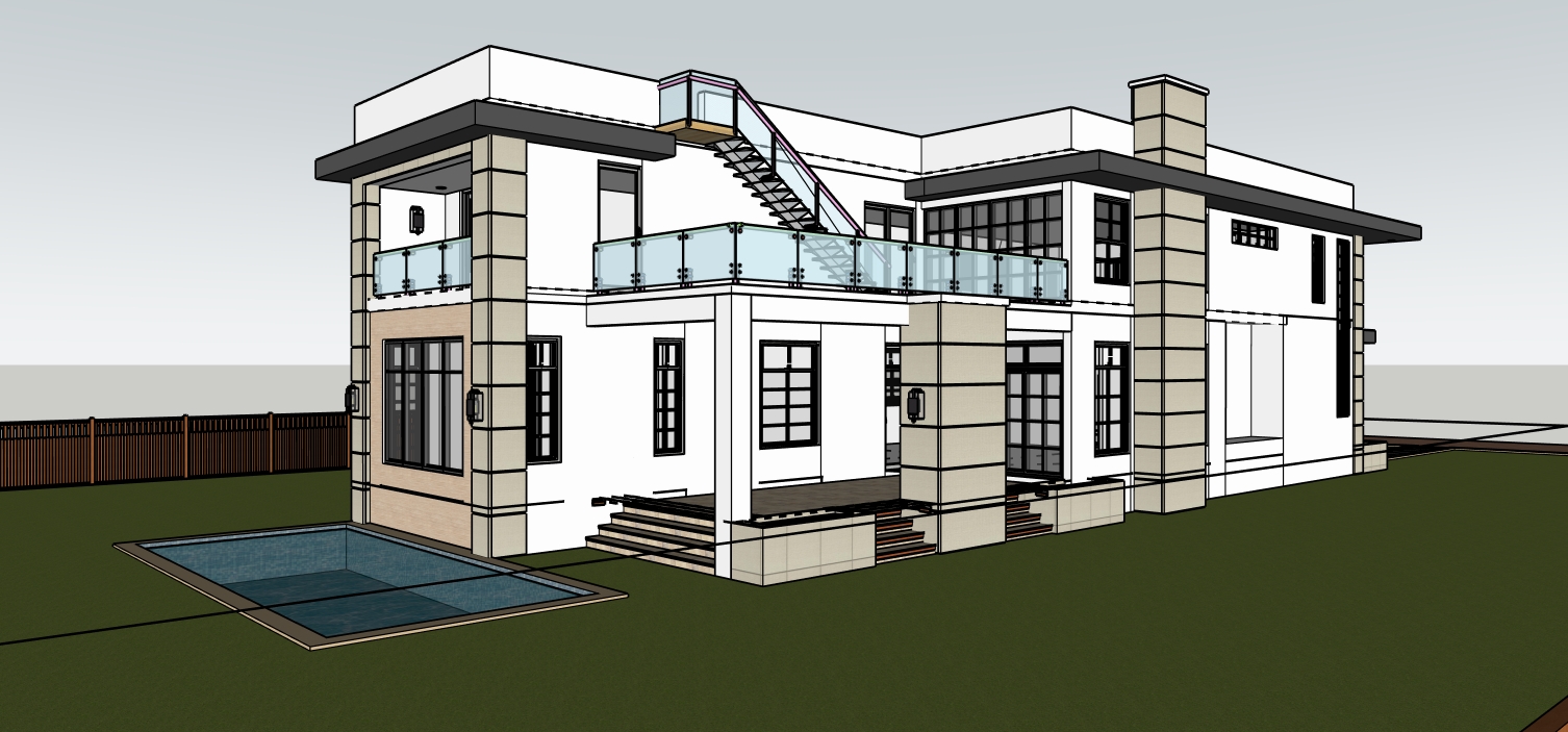 modern exterior shot contemporary two story modern house smooth matte white stucco walls large vertical marble cladding panels with subtle gray veining horizontal warm wood slat accent panels black aluminum window frames flat roof with dark charcoal fascia trim glass balcony railing with metal supports exterior wall sconces integrated light gray concrete entrance steps minimal tropical landscaping clean florida suburban context well maintained green lawn small reflective pool with calm water golden hour lighting warm sunlight soft long shadows realistic material textures high detail surfaces subtle reflections on glass physically accurate lighting professional architectural visualization style architecture