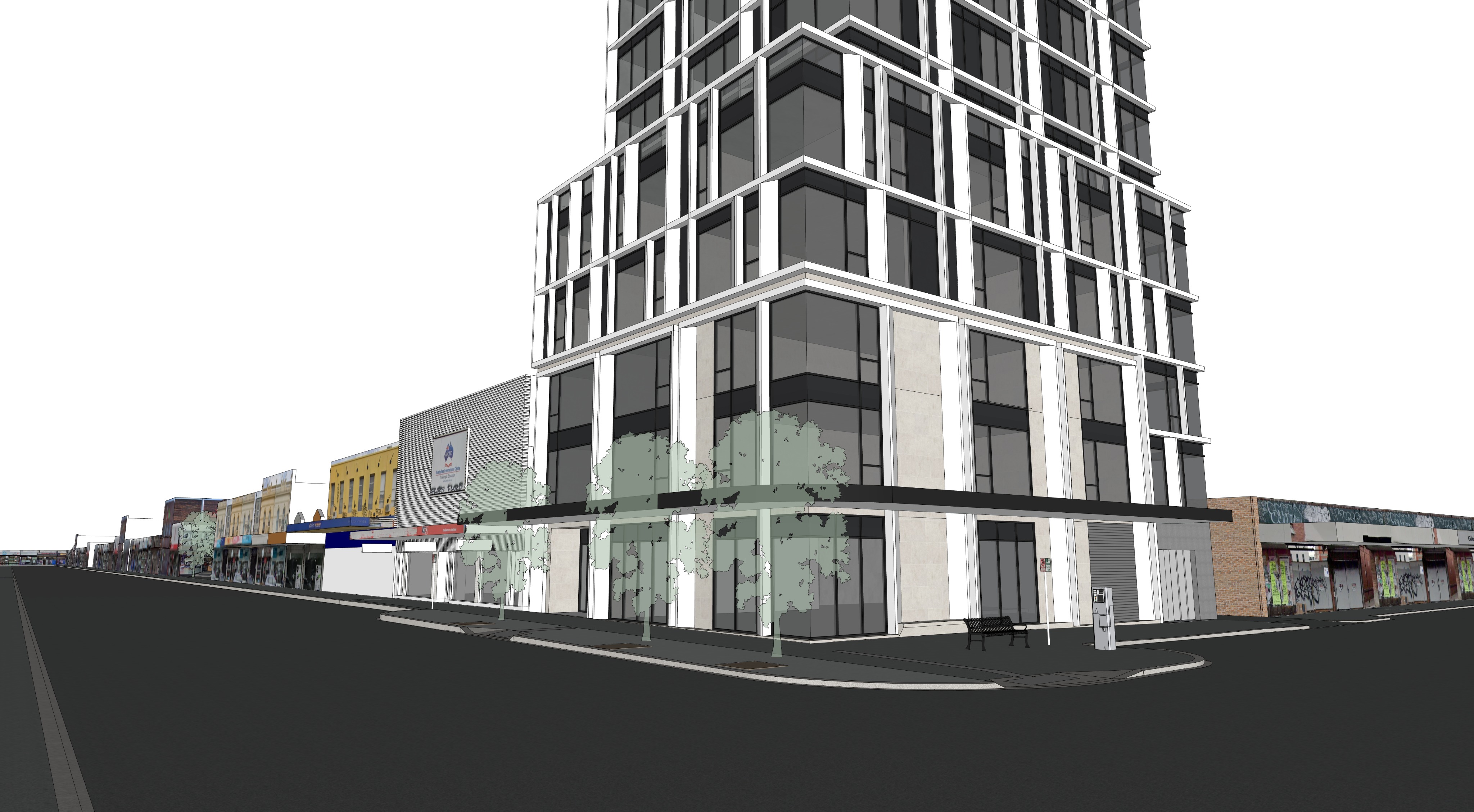 contemporary service apartment building with curtain wall glazing off white frame cladding with black glass color on facade people walking outside in the afternoon