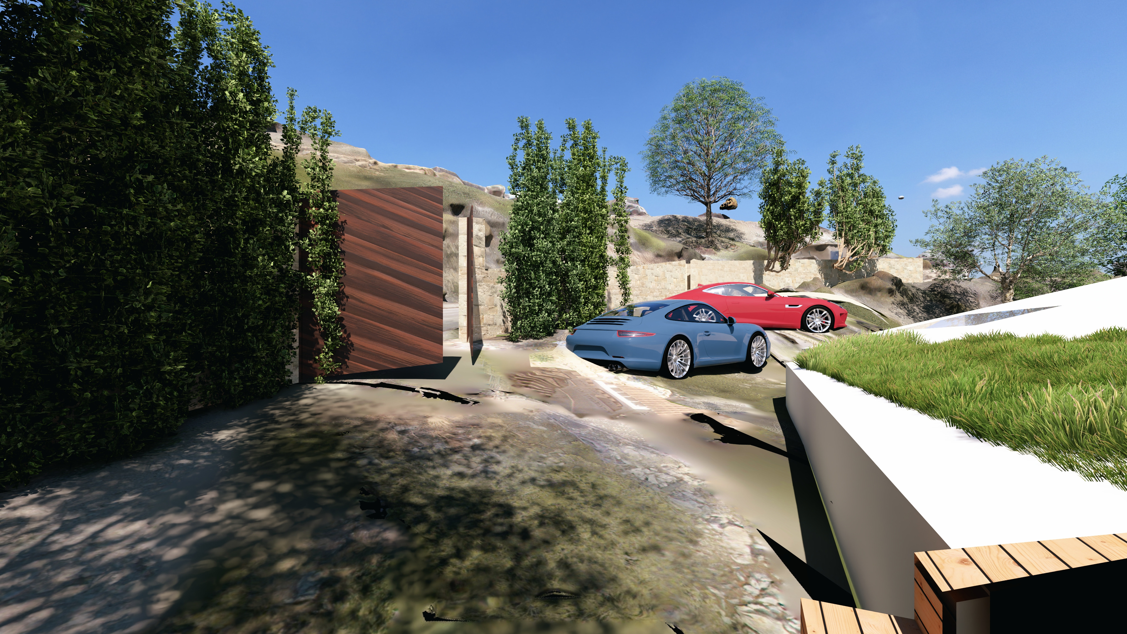 mejorame esta imagen para que parezca una casa lujo se entienda bien el espacio de aparcamiento se mejore el camino de bajada peatonal con escaleras y espacios ajardinados y se perciba el muro de parcela de piedra vista