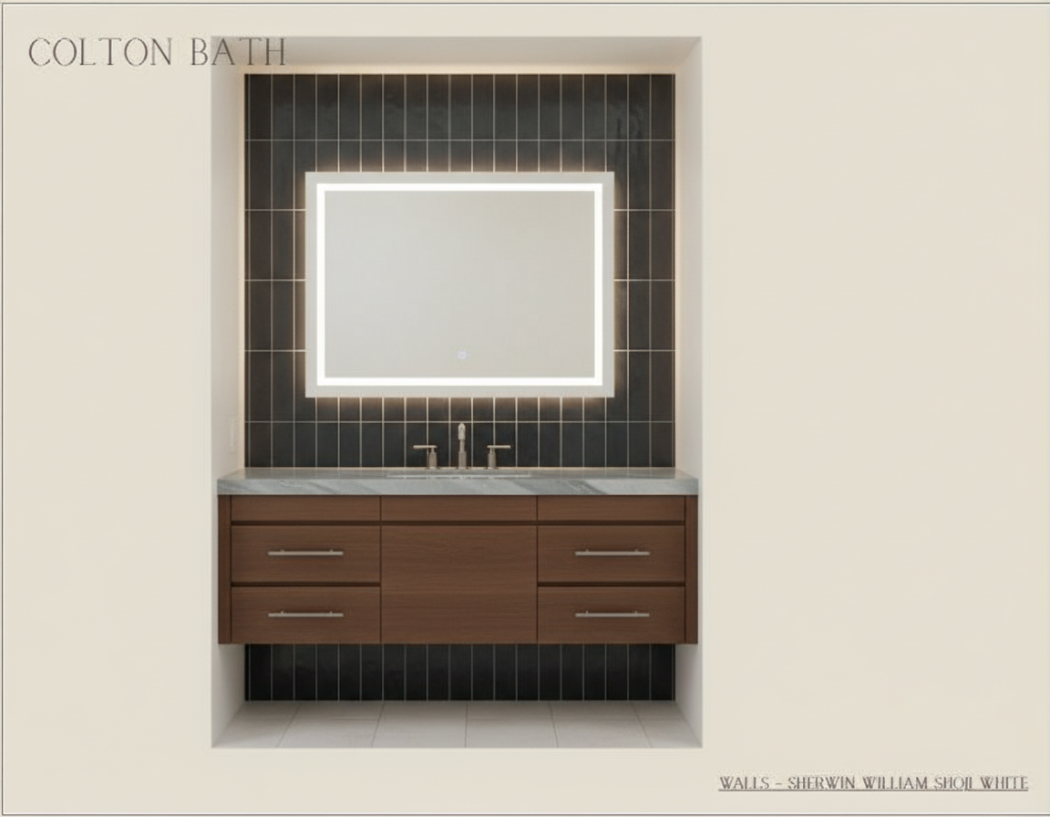 change vanity graining to be vertical and change format of dark blue tile to be a 2x16 but show installed vertically