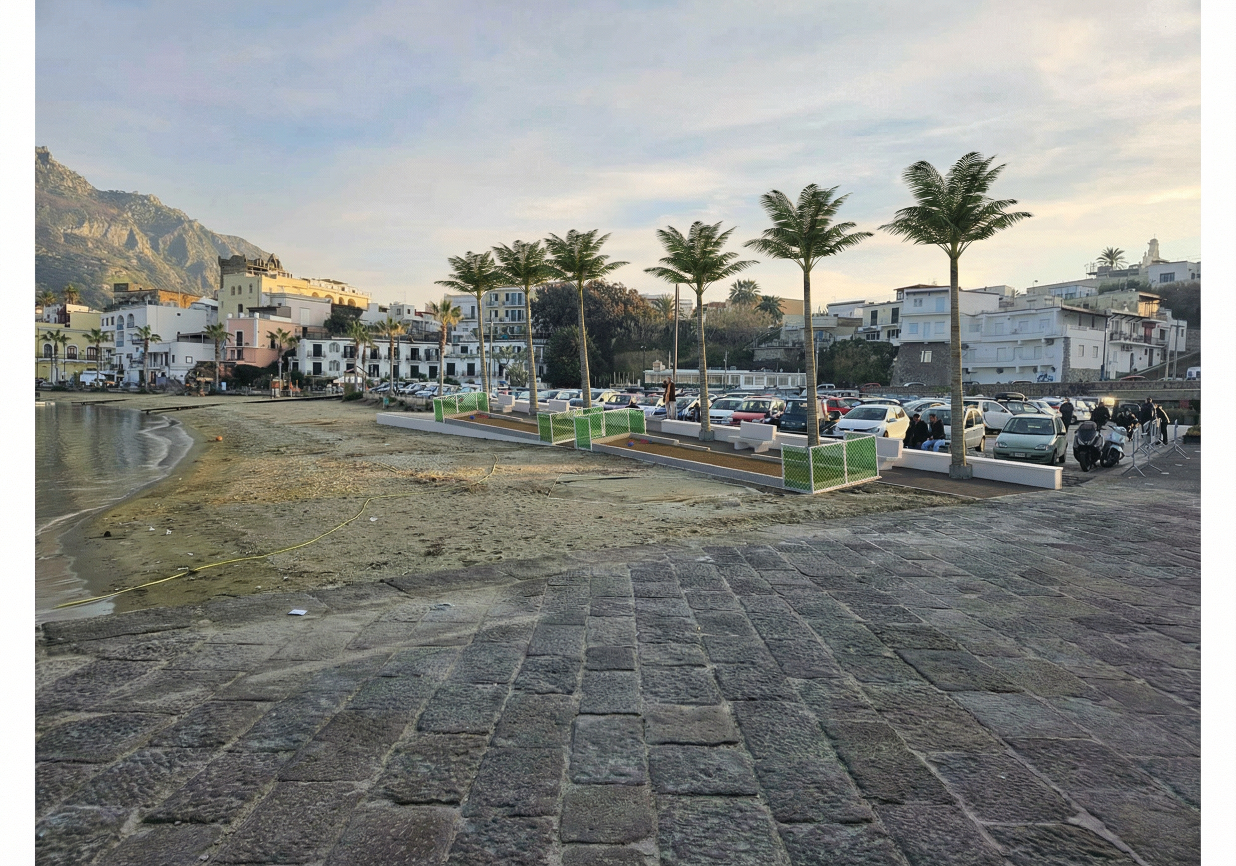 keep view and material as is on the left backsplash is black glossy tile with noen sign counter in front is with the concrete texture panel keep as per the image middle cylinder has glossy black tops add glossyness to the floor keep same texture