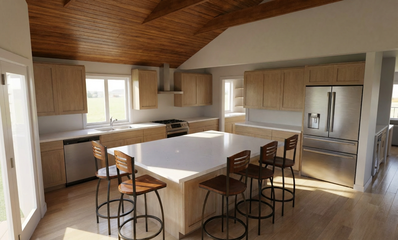 make this picture look photorealistic add minimal interior objects to table tops add minimum lights to the ceiling