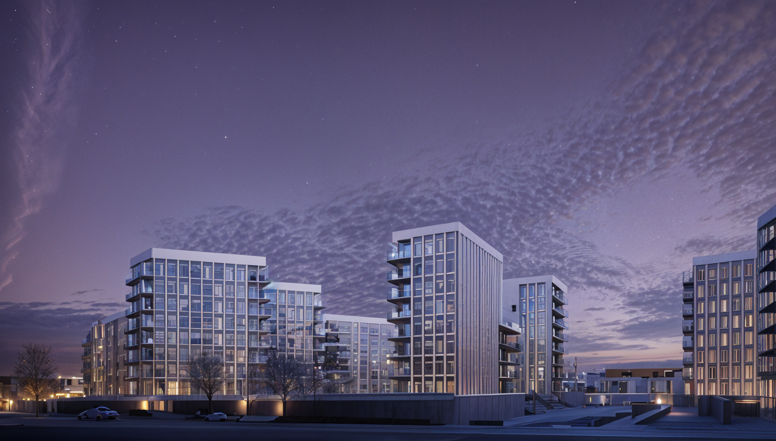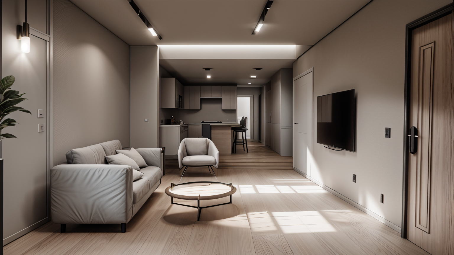 modernist interior shot create a luxurious banquet hall atmosphere with dim ambient lighting use deep charcoal gray for the walls and floors accentuated by soft purple lighting that casts elegant shadows adorn the tables with ivory tablecloths and gold candlesticks incorporate dark wood chairs with beige cushions for sophistication add lush green plants in large dark gray vases for contrast use vibrant magenta and blue neon art pieces on the walls for a modern touch aim for an upscale elegant atmosphere with a contemporary flair architecture