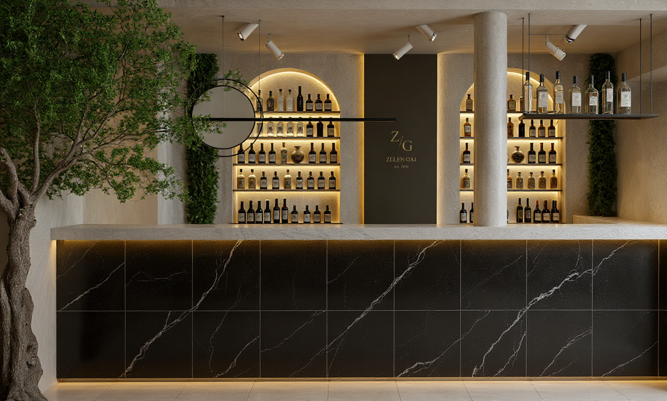 keep the same camera angle proportions lighting and overall composition do not change the image format ignore the current arches completely and replace that area with large format marble panels on the wall of the counter the marble should look elegant dark and natural with minimal visible joints and fine 1 mm grout lines matching the marble color keep the stone edge of the bar exactly as it is do not modify or remove it everything else in the scene must stay identical and high quality do not move resize or change any other elements or lighting in the scene