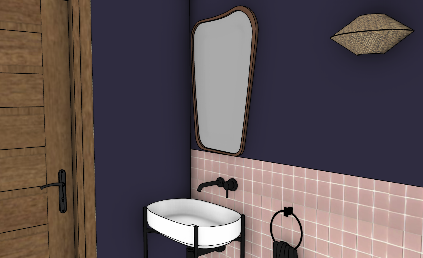 photorealist toilets sink light pinkltiles and deep blue painting soft daylight