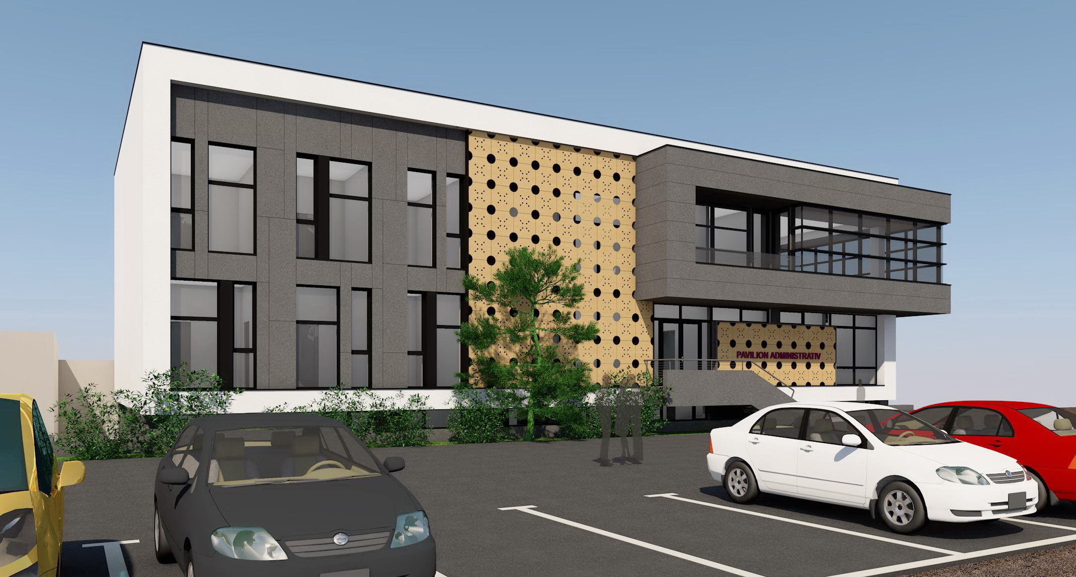 convert the image into a realistic outdoor photograph with professional architectural aesthetic maintaining 100 of the geometry and layout applying authentic materials afternoon warm lighting with soft shadows and a sharp photorealistic result add landscape design behind the building do not change material colors do not add hills or mountains in the landscape replace people with real persons