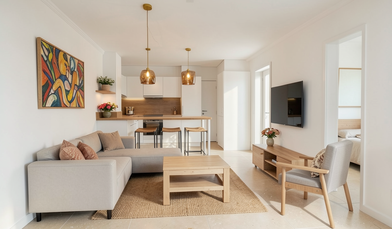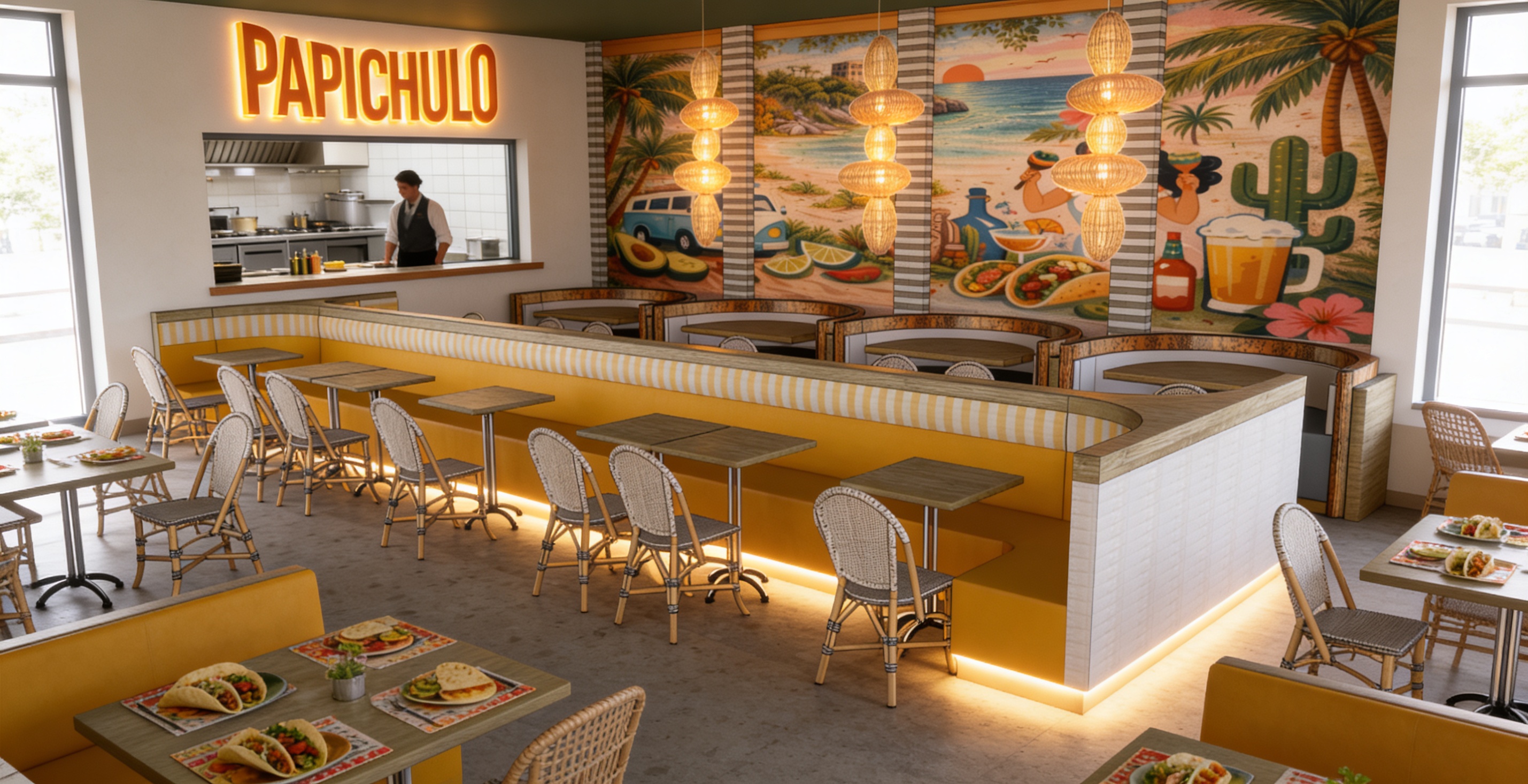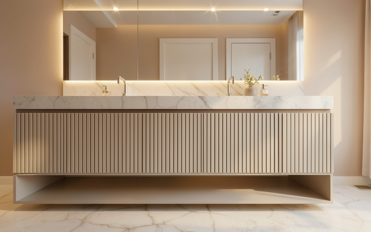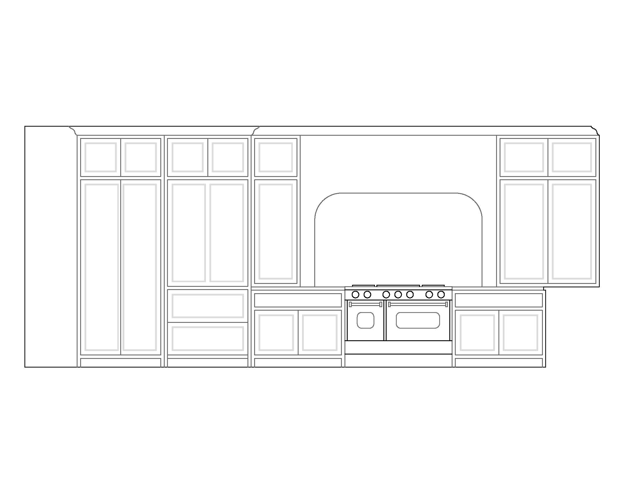 solid medium wood cabinets with white arch and light marble backsplash make return wall with sink and windows above